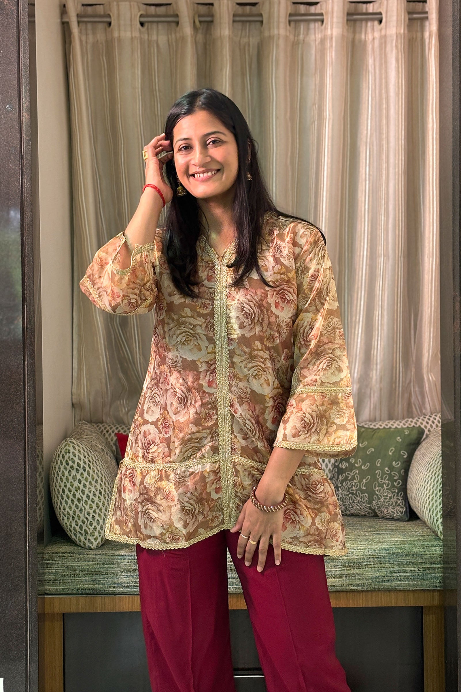 For the days when you want to whisper luxury, not scream it 🌹✨ This 3-piece co-ord set features a vintage rose floral digital print tunic in a semi-sheer shimmer crush fabric — subtly shiny, beautifully breathable. The vertical gold lace detailing and bell sleeves add a soft festive charm, while wine-toned solid palazzos ground the look with richness. Comes with a matching spaghetti inner to complete the set — it’s your perfect pick for intimate dinners, festive brunches, or stylish get-togethers.