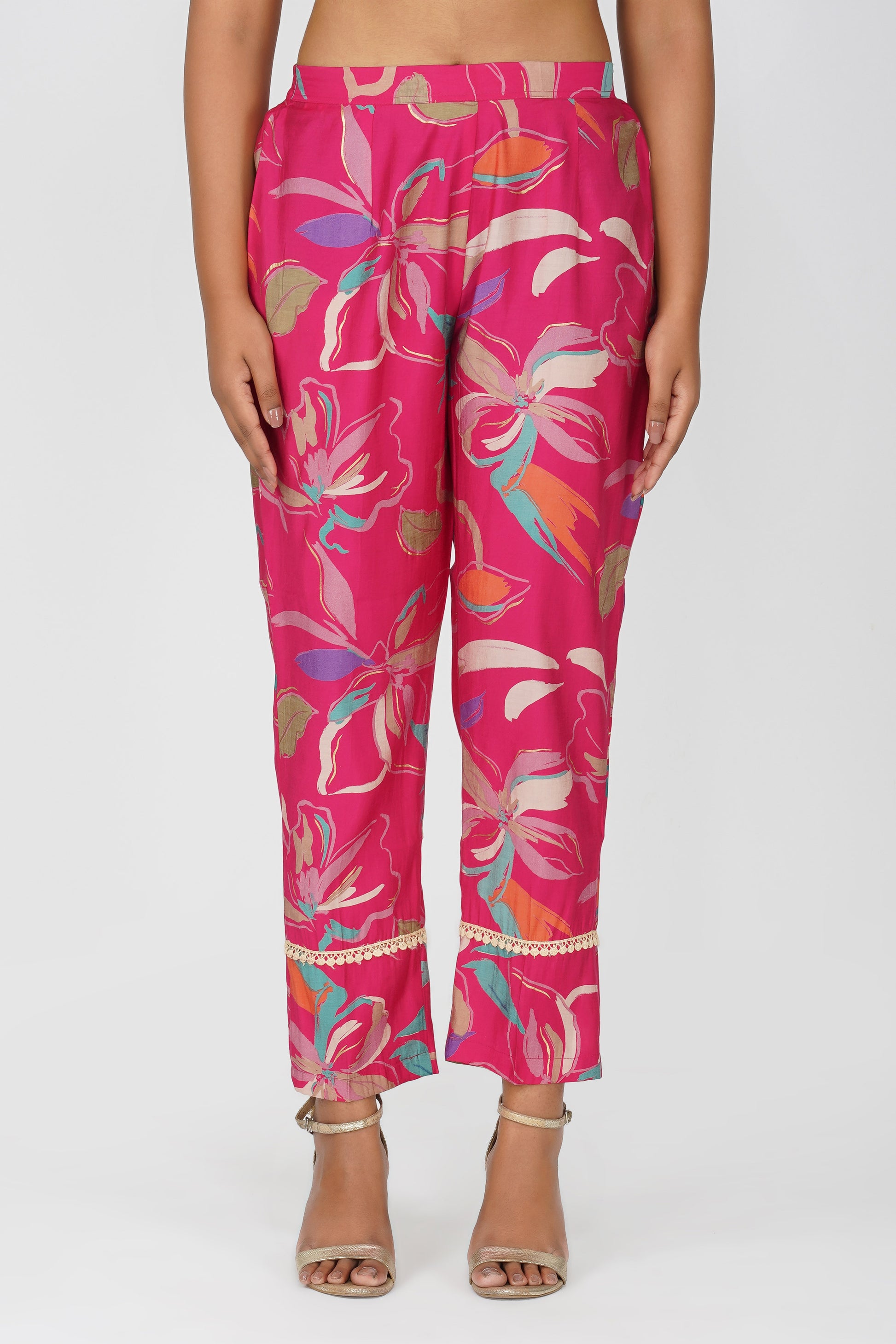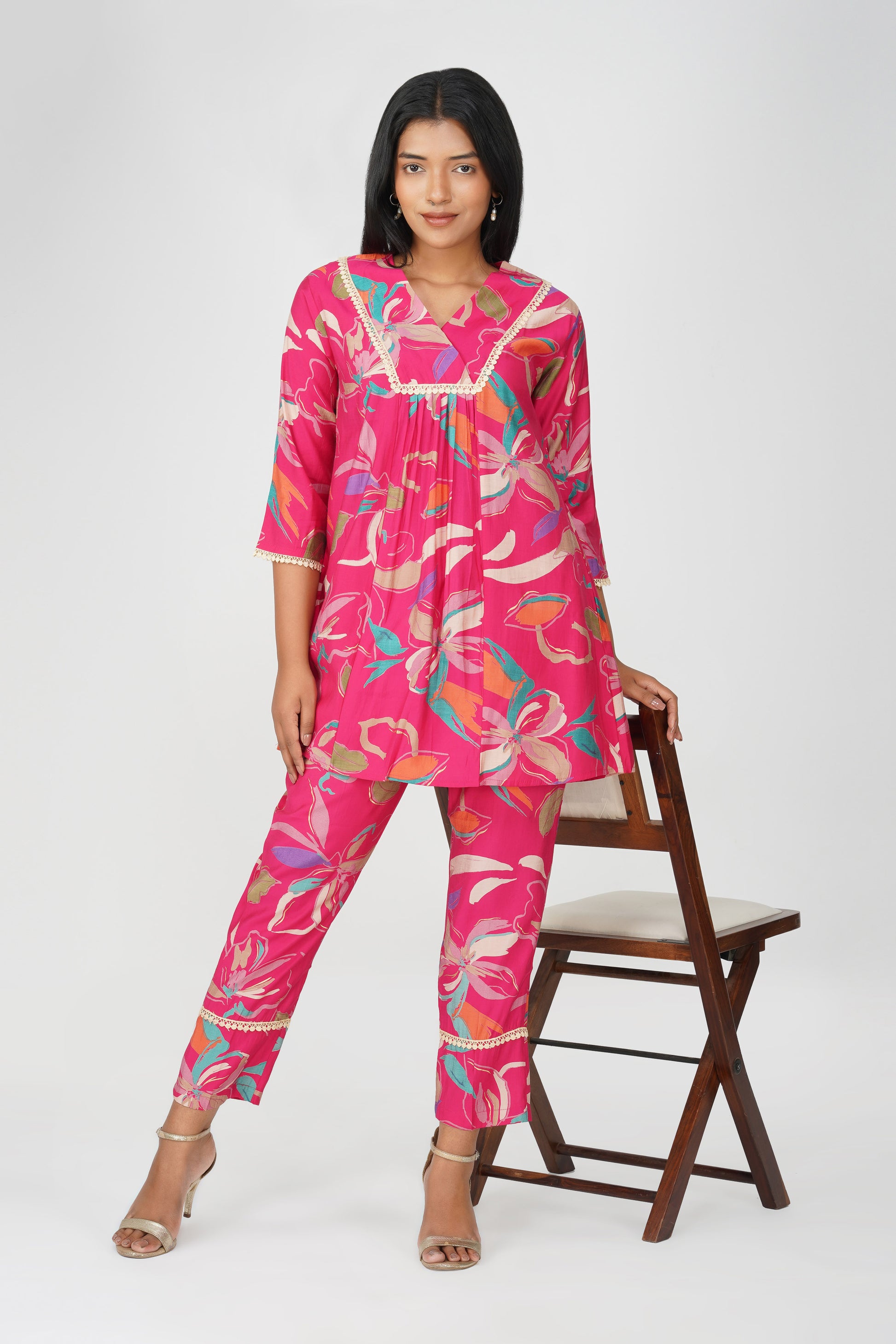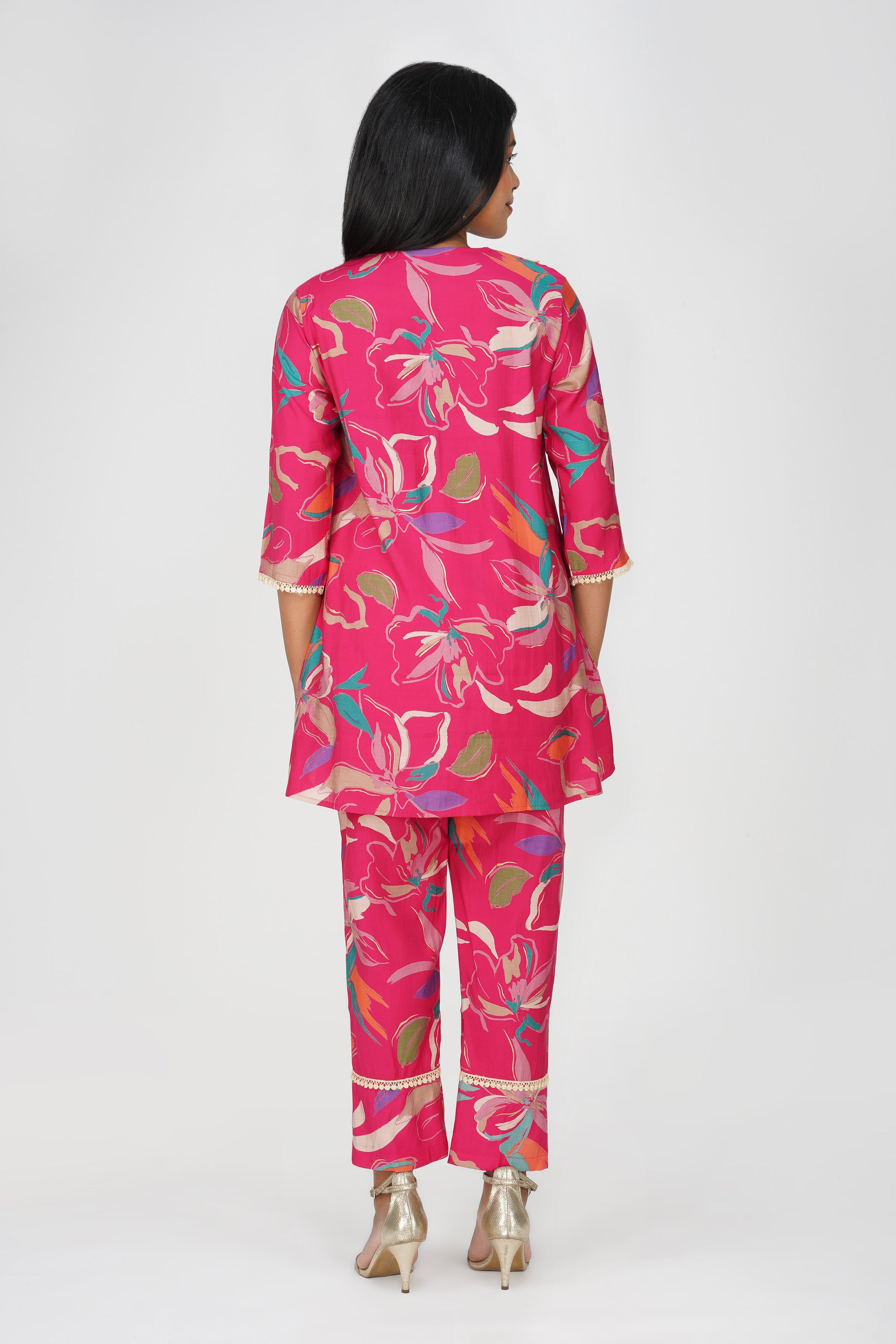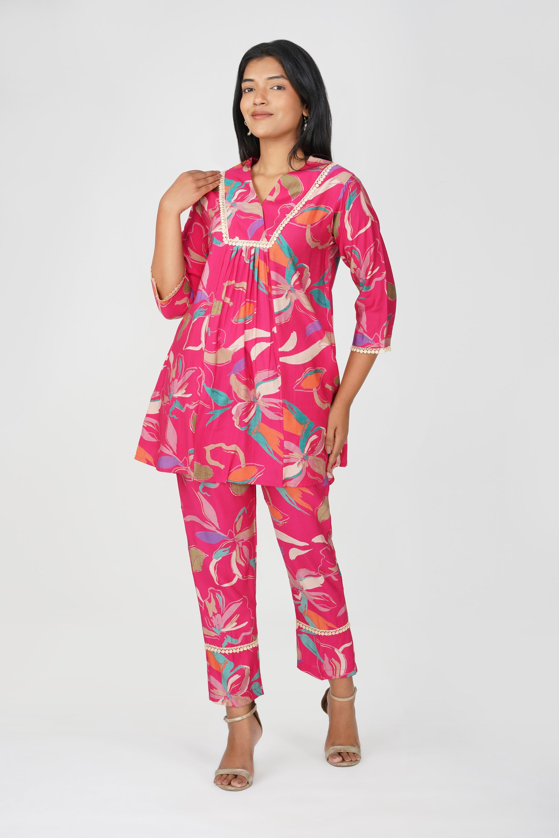 A statement flared kurta in vibrant abstract pink print πΈ, designed with jaali lace at the yoke, sleeves, and hem. Comes with wide-leg printed palazzos and a handy pocket, this set adds joyful ease to your wardrobe β ideal for smart casual plans, brunches, or just feeling fabulous every day.