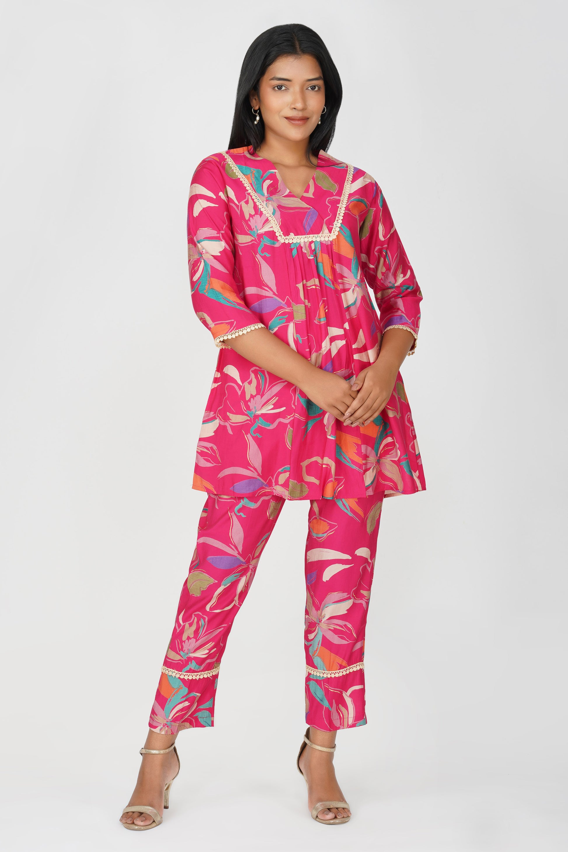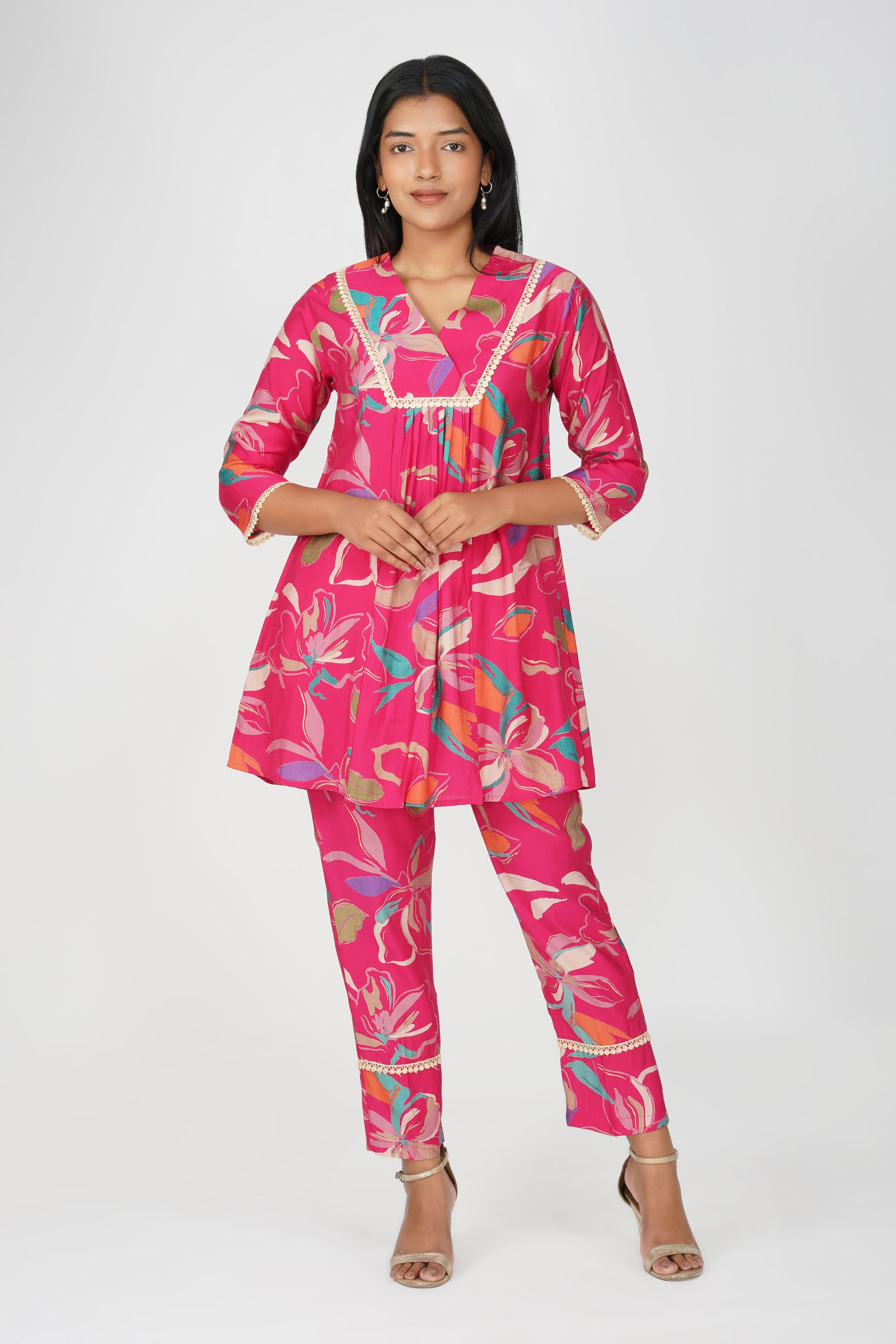 Pink Abstract Printed Co-ord Set β Sia Flared Kurta with Palazzo Pants
