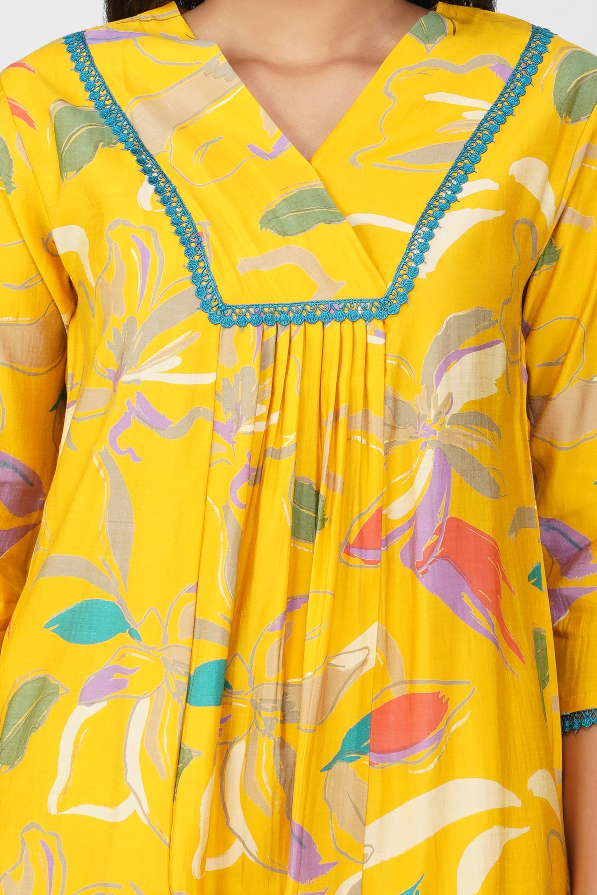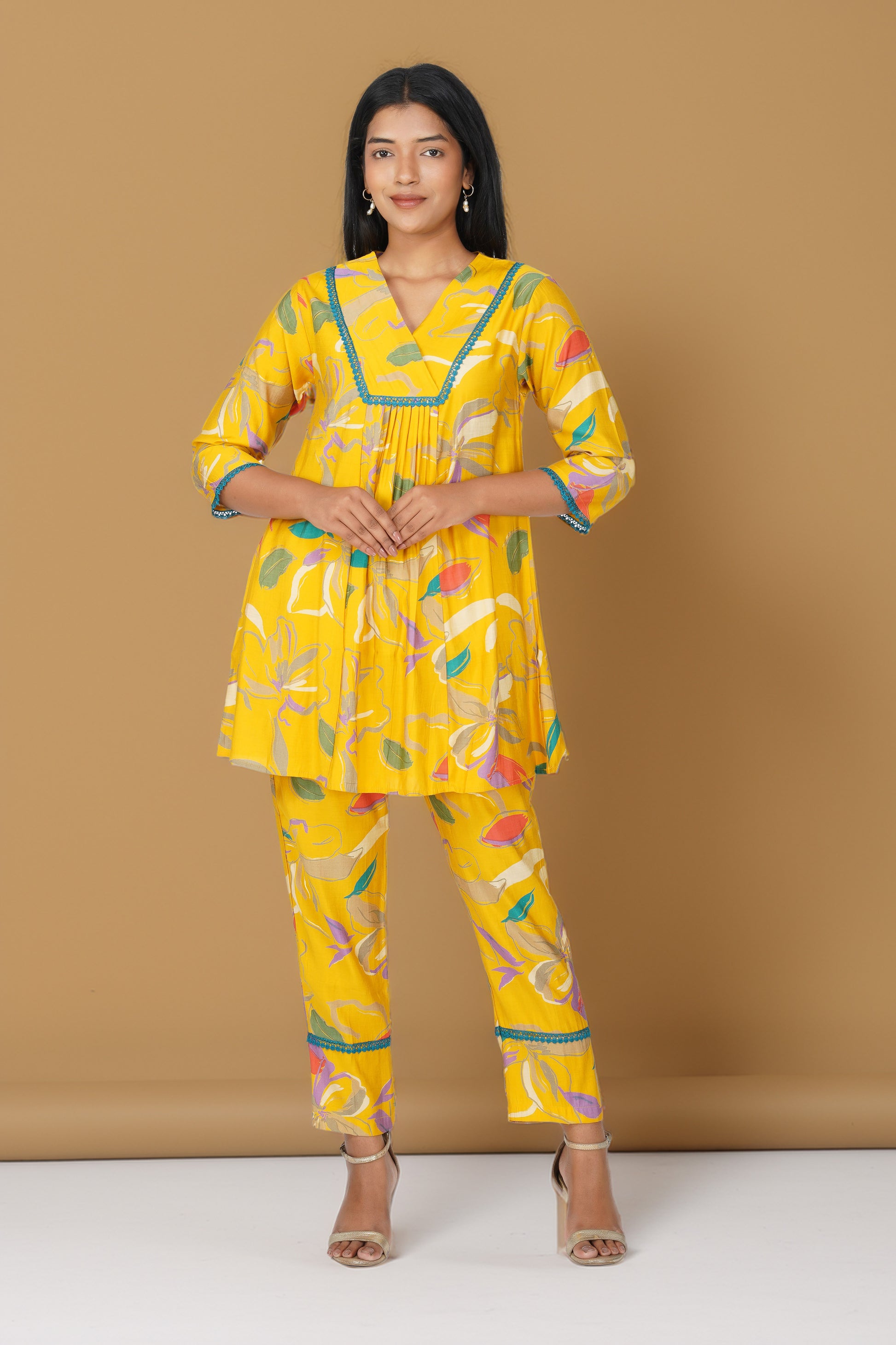 Yellow Floral Printed Co-ord Set โ Flared Kurta & Printed Modal Pants