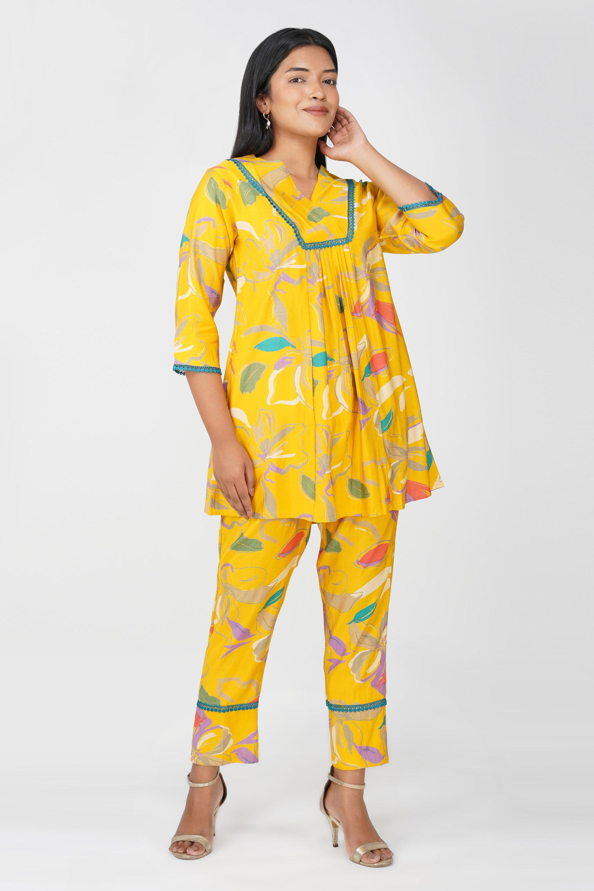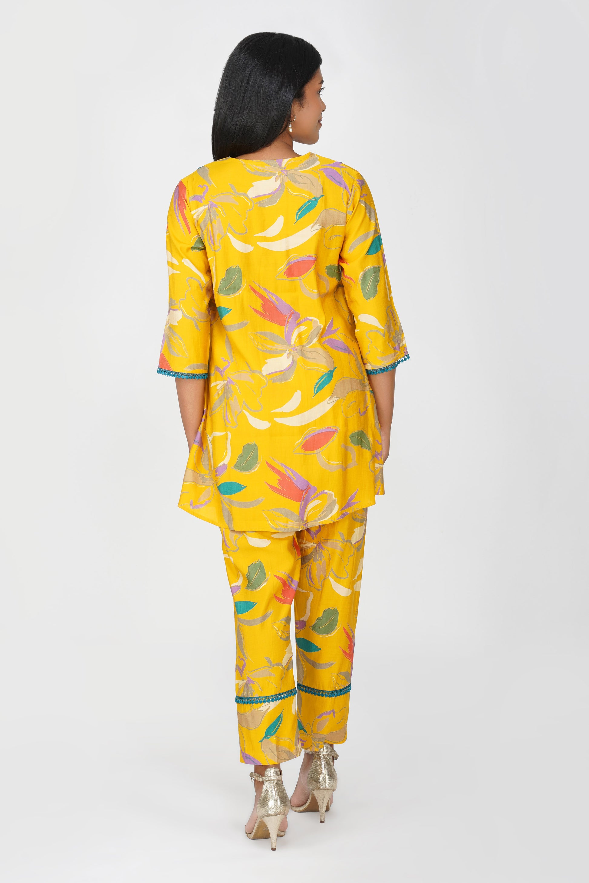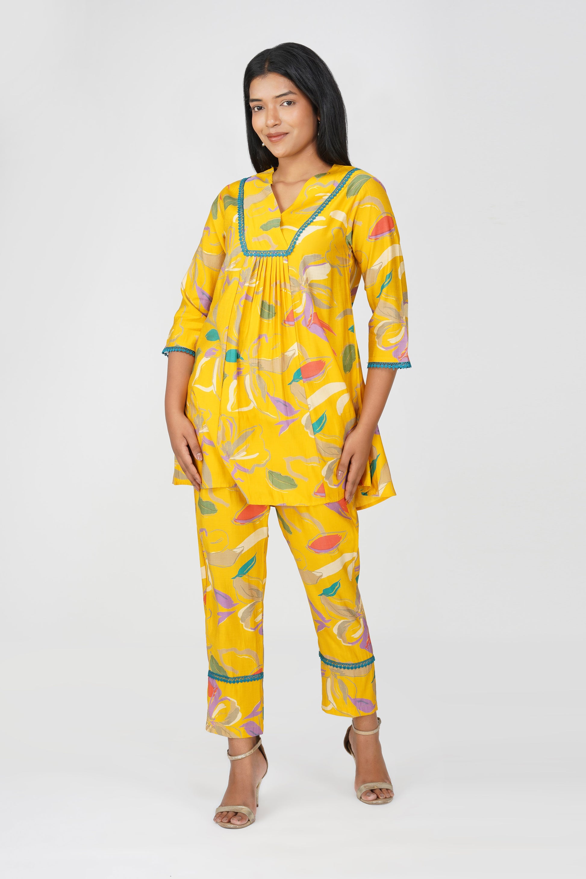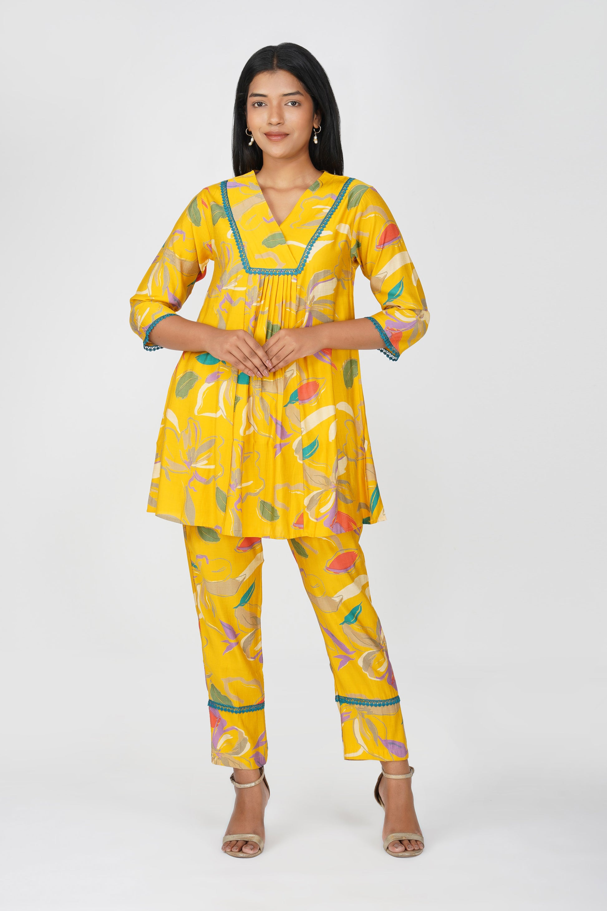 A breezy flared tunic in sunshine yellow ๐ featuring whimsical floral illustration prints and jaali lace detailing at the yoke, sleeves, and hemline. Paired with matching printed pants in a regular fit with a pocket, this co-ord is your perfect companion for easy, everyday elegance with a touch of charm.