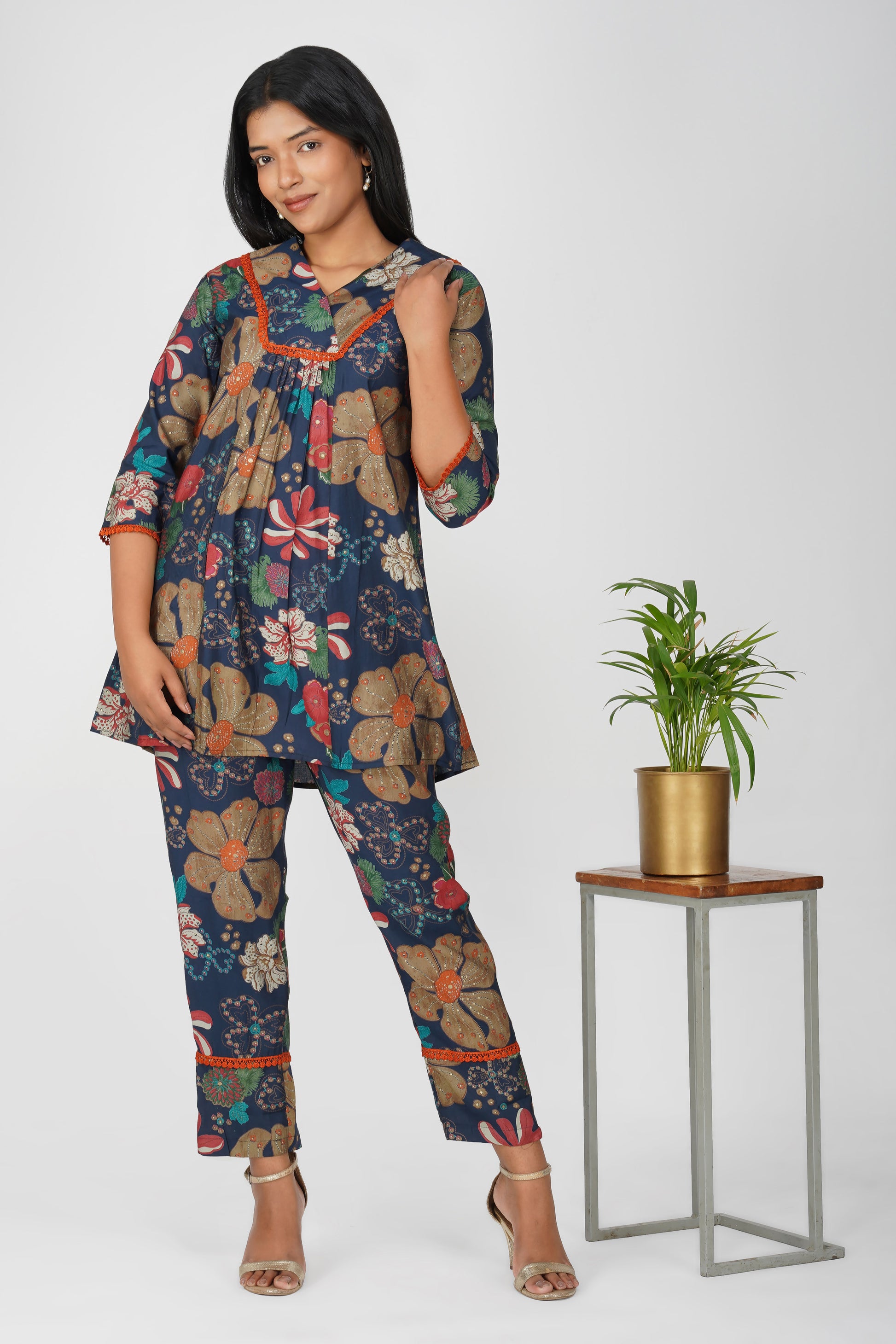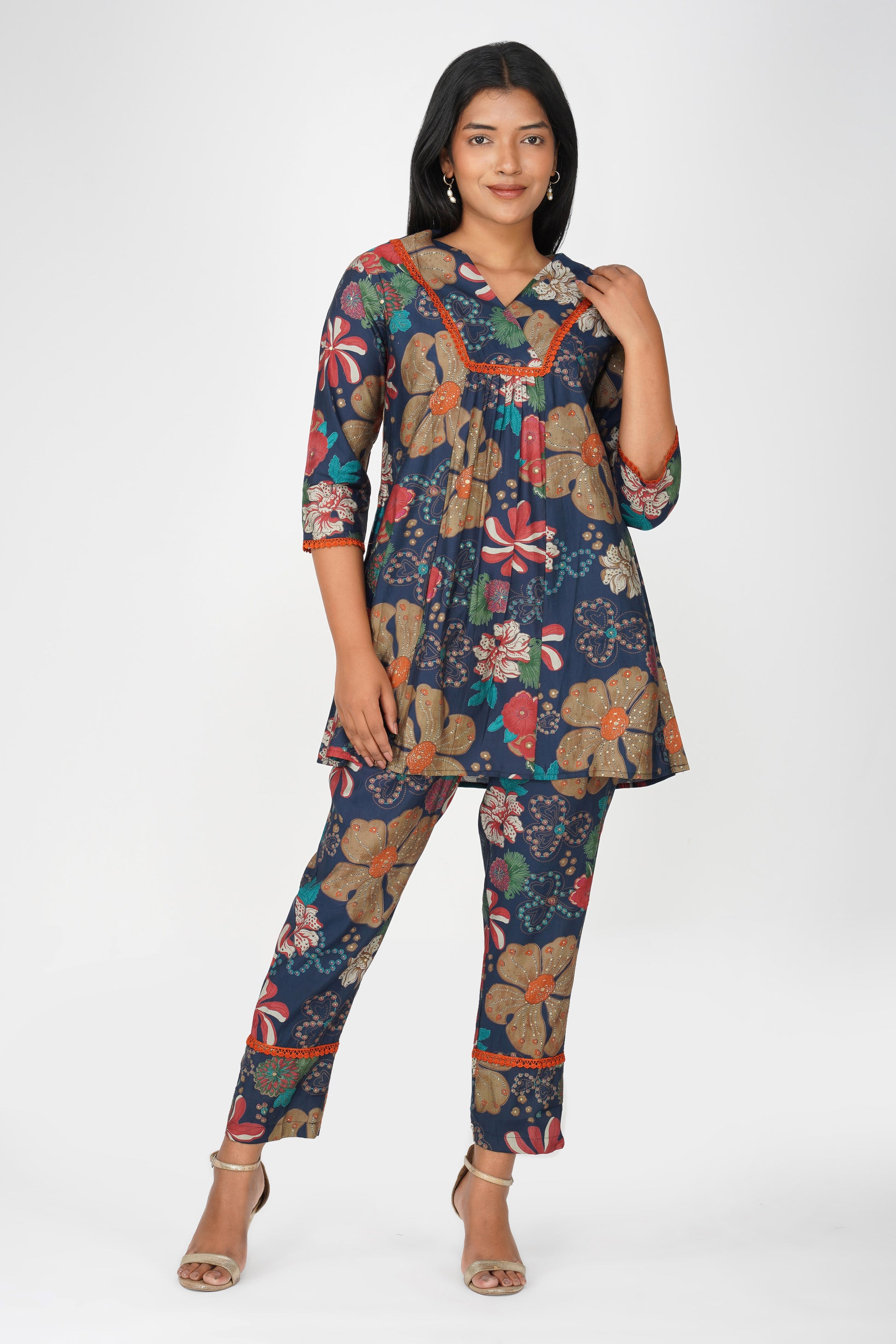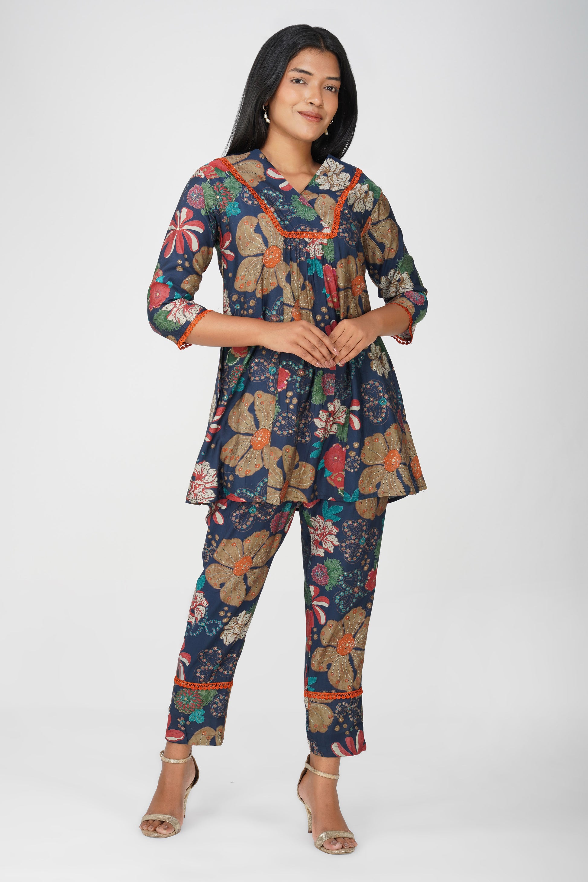 A bold flared kurta in rich navy with multicolour floral illustrations 🌺 detailed with jaali lace at the yoke, sleeves, and hemline. Paired with matching printed palazzo pants and a pocket for ease, this co-ord is a confident blend of structure, comfort, and standout style for your everyday or weekend wardrobe.