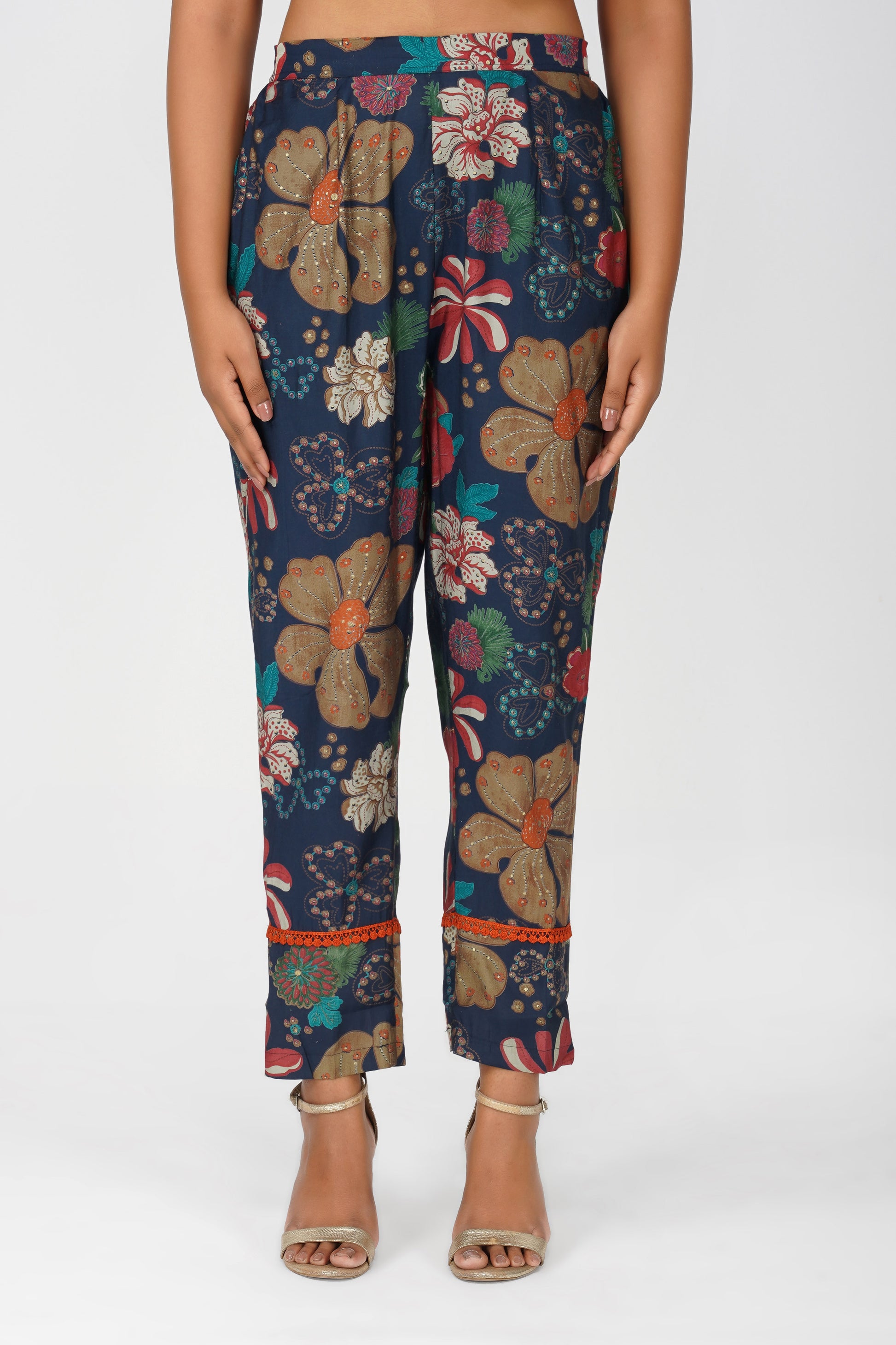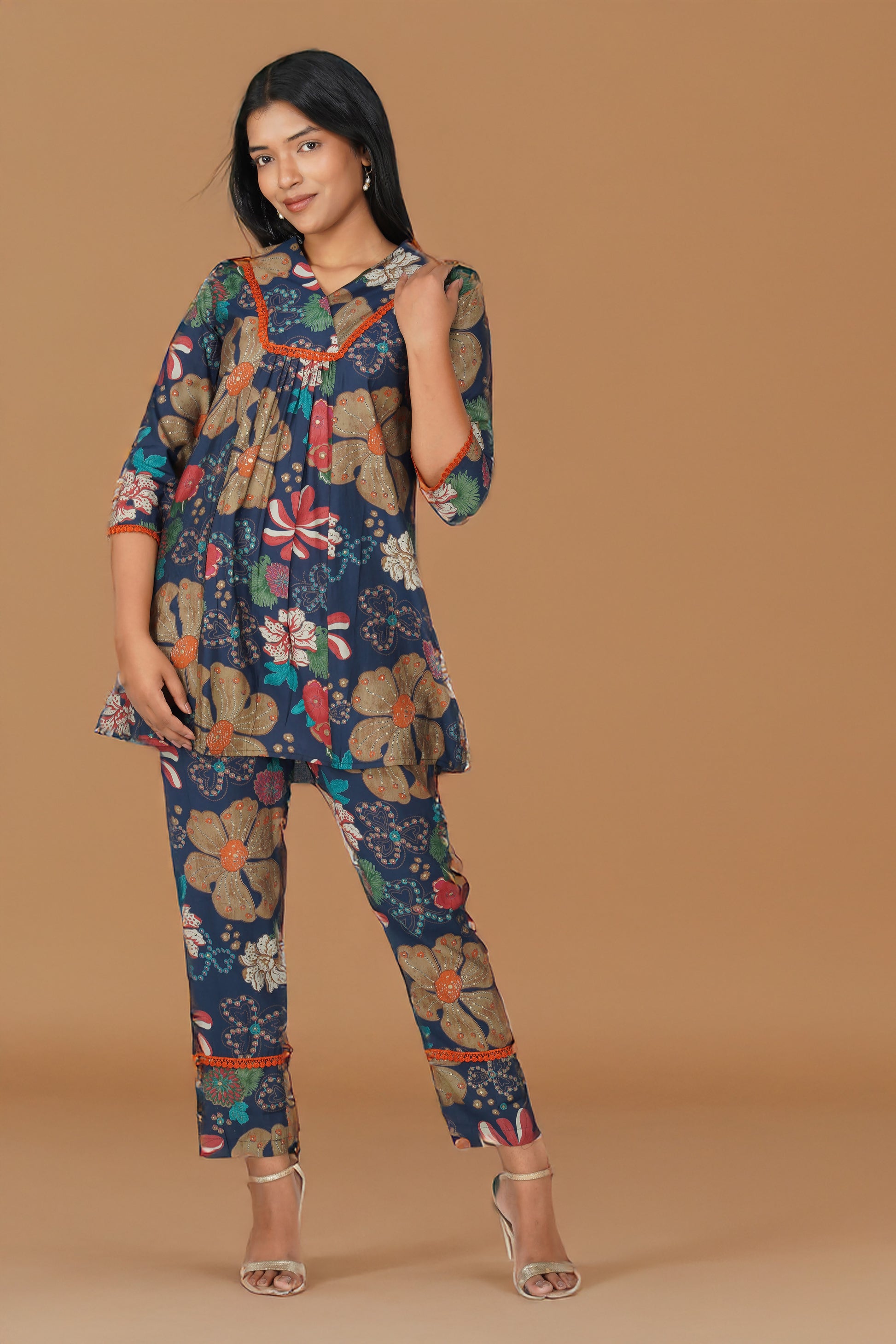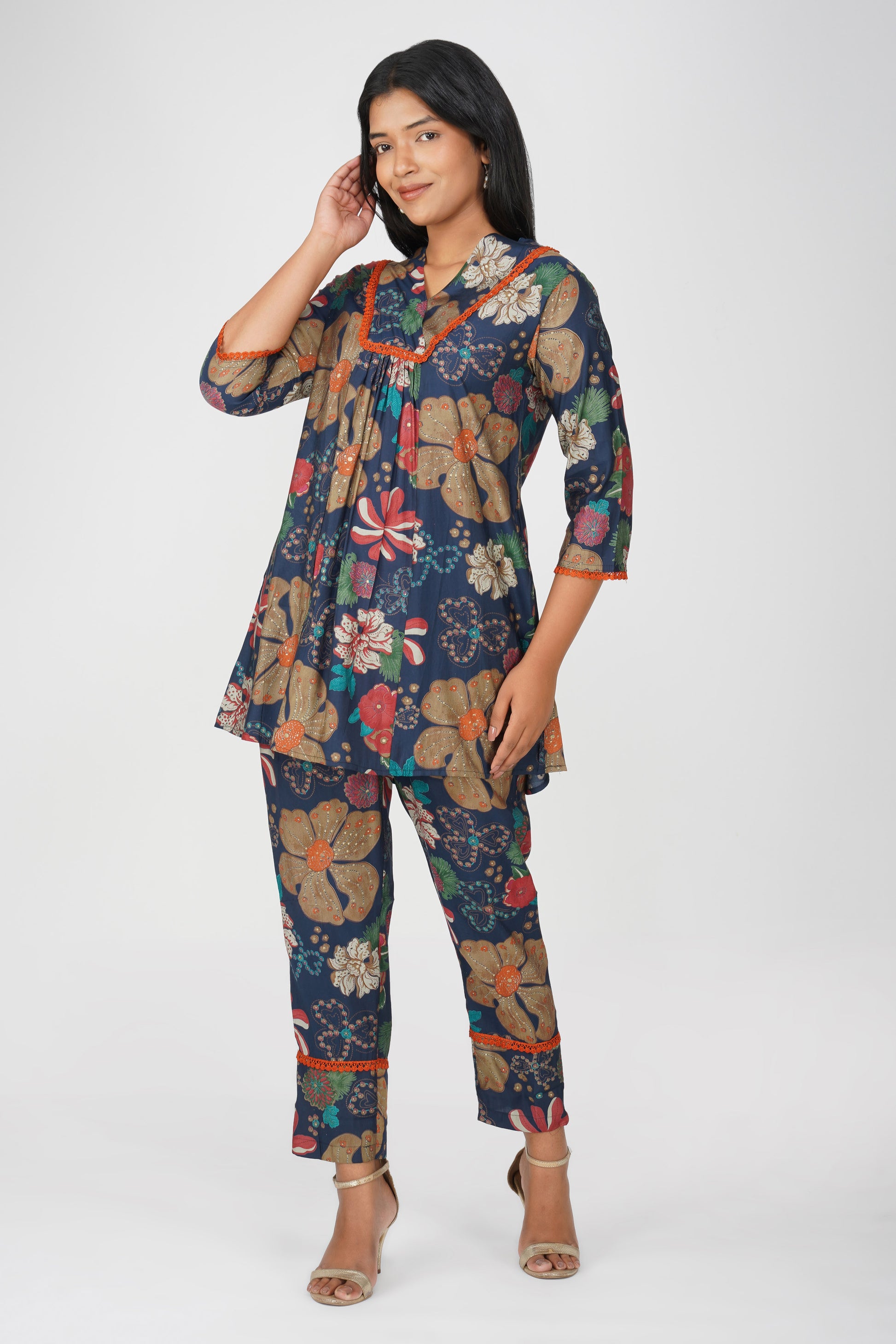 A bold flared kurta in rich navy with multicolour floral illustrations 🌺 detailed with jaali lace at the yoke, sleeves, and hemline. Paired with matching printed palazzo pants and a pocket for ease, this co-ord is a confident blend of structure, comfort, and standout style for your everyday or weekend wardrobe.