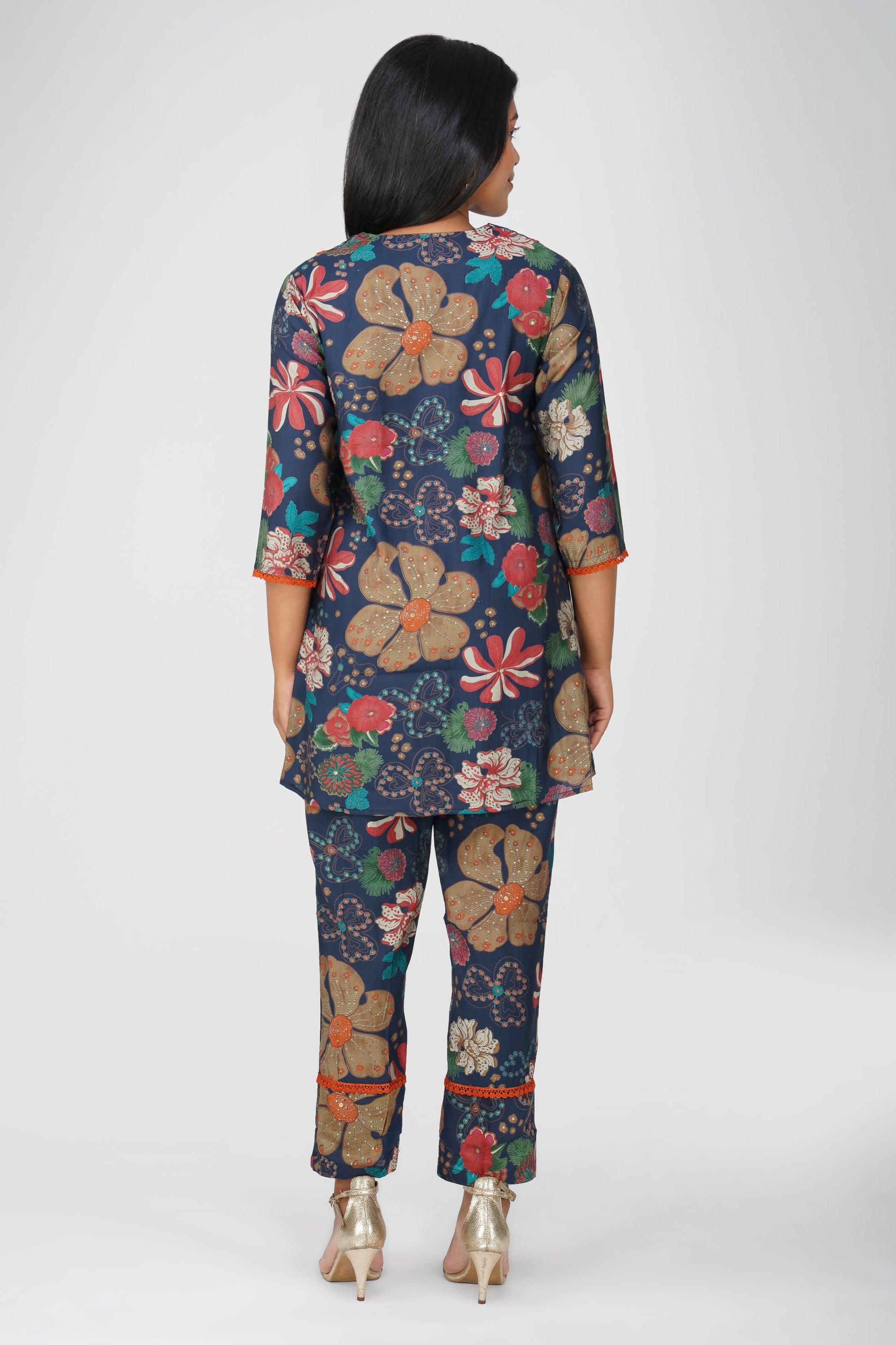 Sia Navy Floral Illustration Co-ord Set – Flared Kurta & Printed Palazzo Pants
