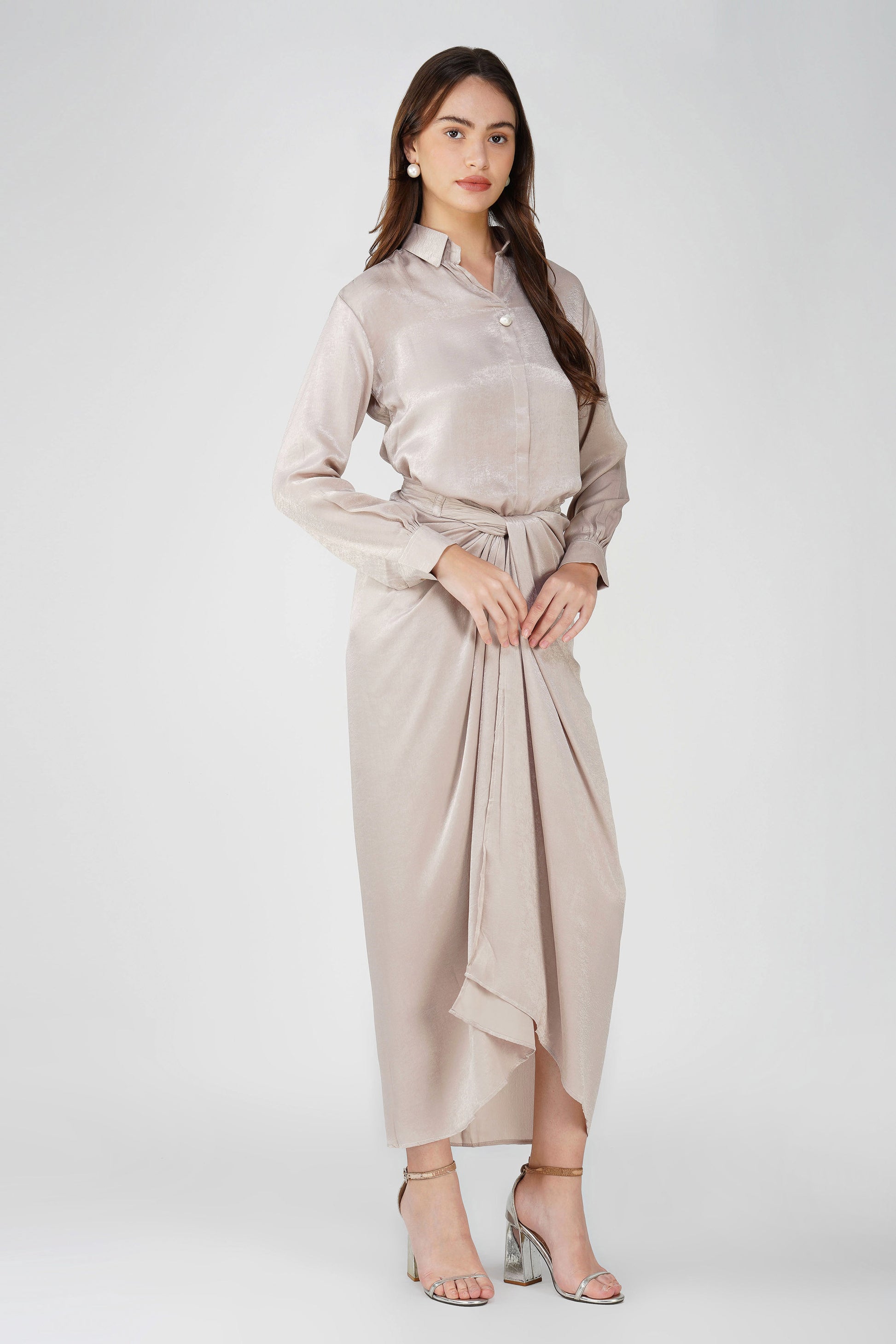 A delicate blend of fluid elegance and modern finesse, Nura in Champagne Glow is a 3-piece ensemble that reimagines draping. The soft velvet-finish satin shirt features a natural pearl button detail at the collar, paired with a sculpted wrap skirt and an attached inner lining for graceful movement and comfort. Versatile, striking, and effortlessly stylish — your go-to for cocktails, festive dinners, and everything in between.