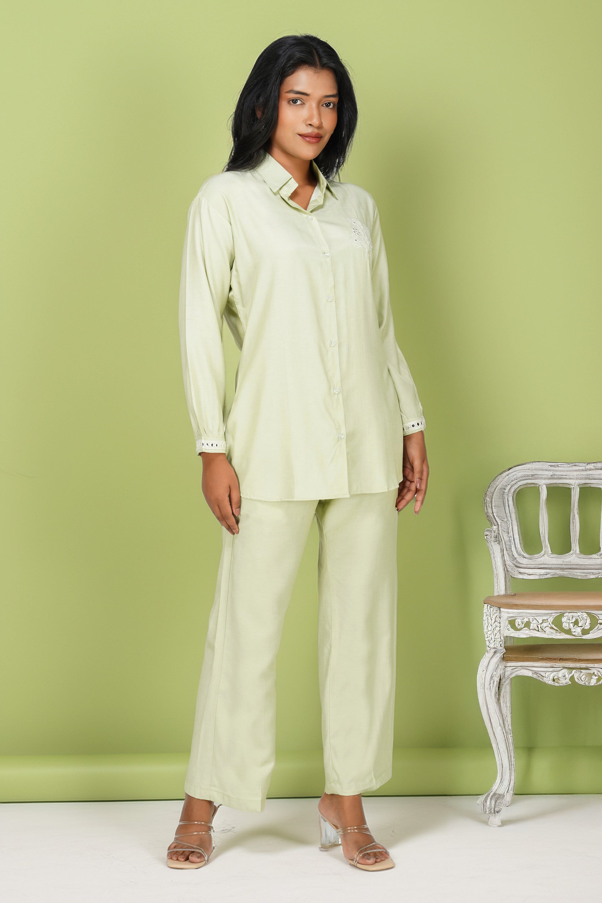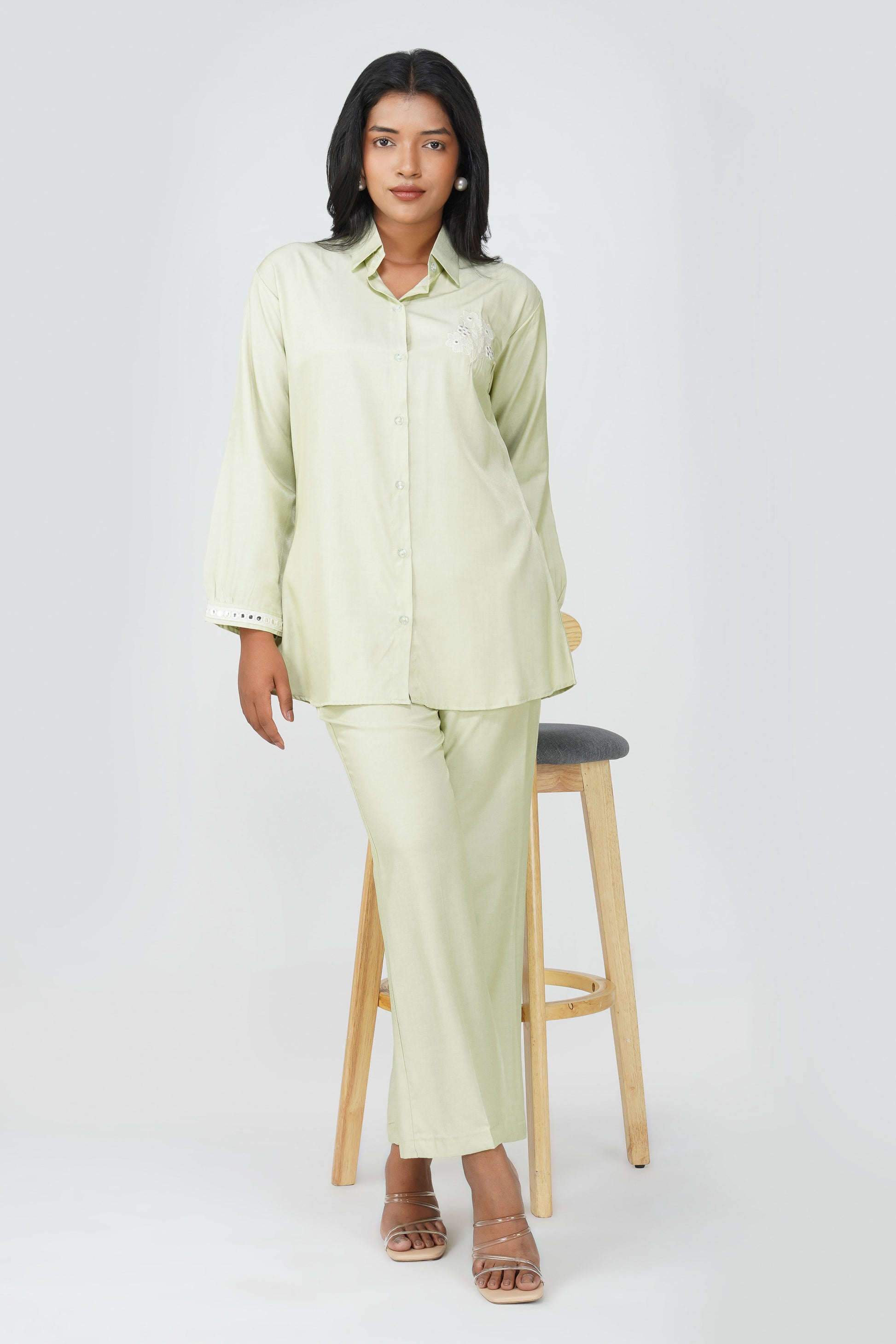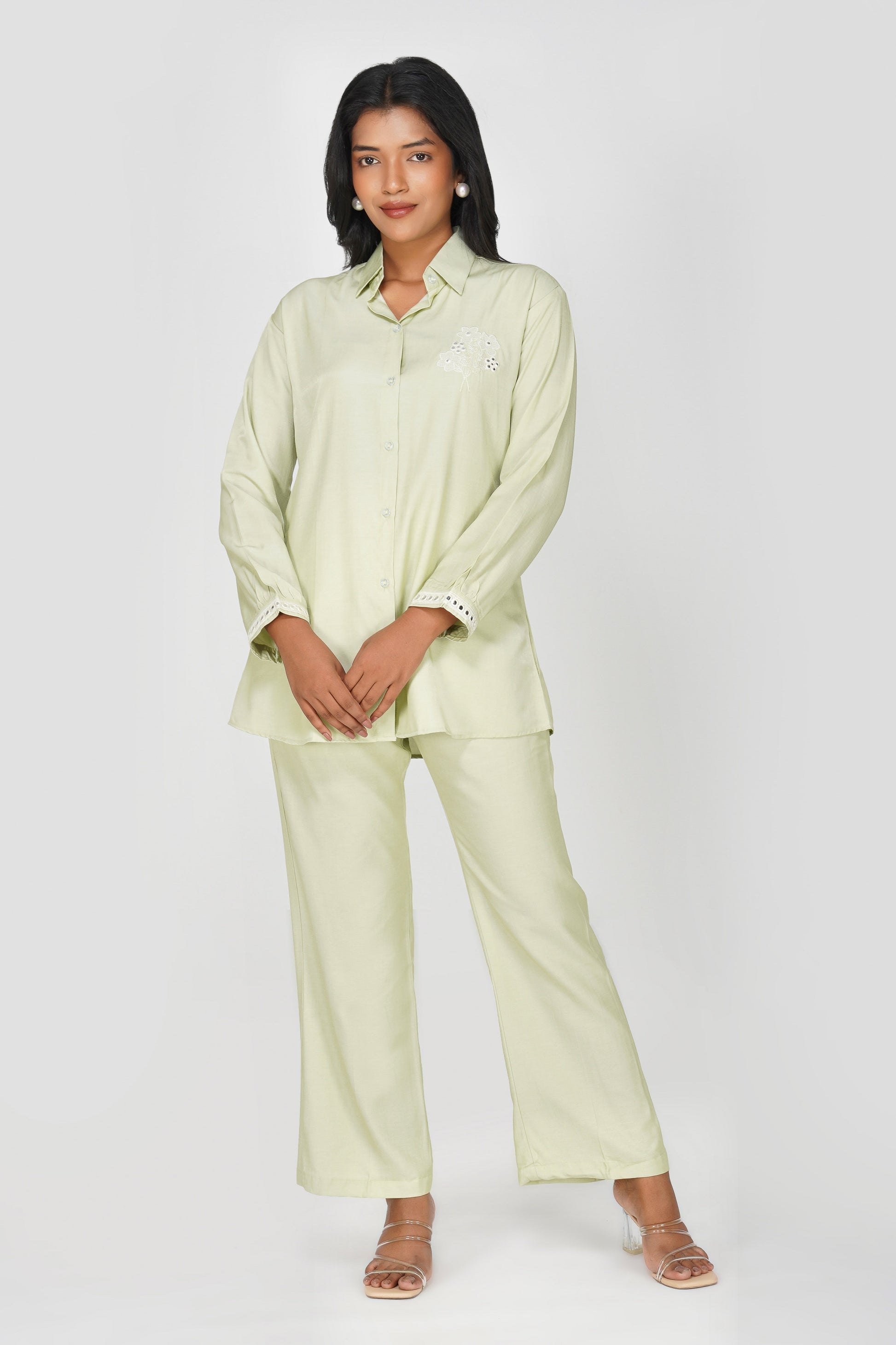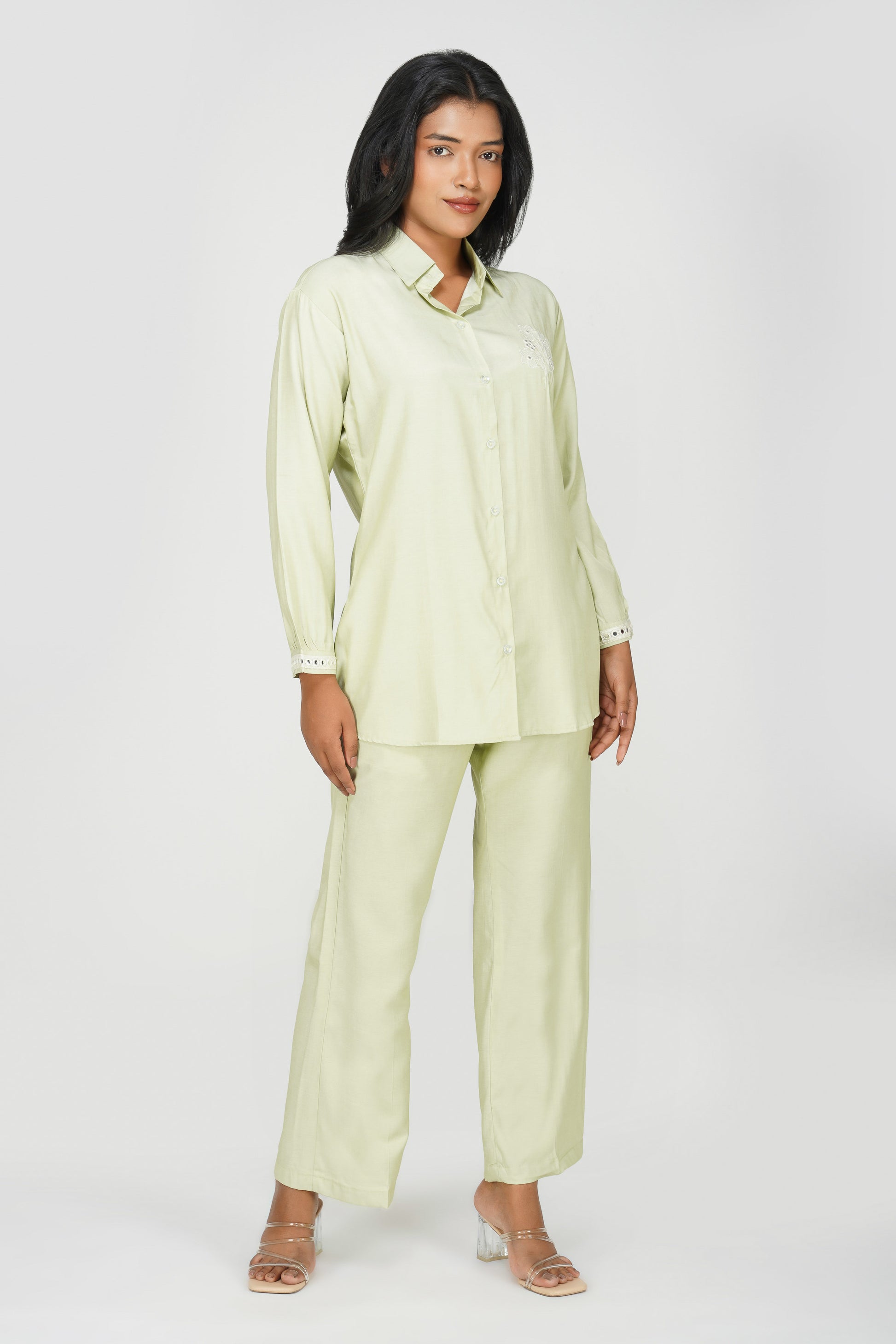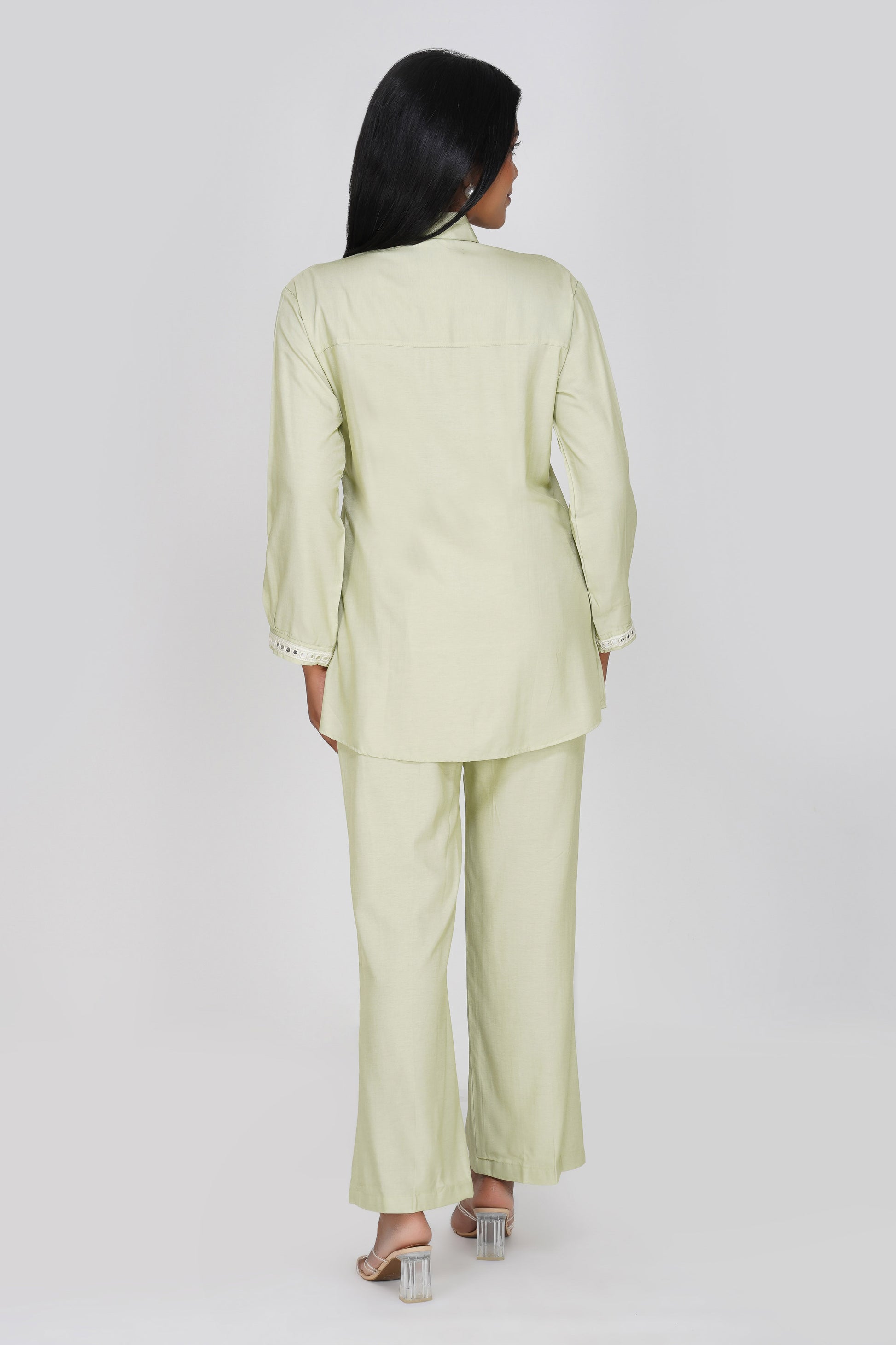 Pastel Green Silk-Denim Co-ord Set โ Mirror Embroidered Shirt & Pants