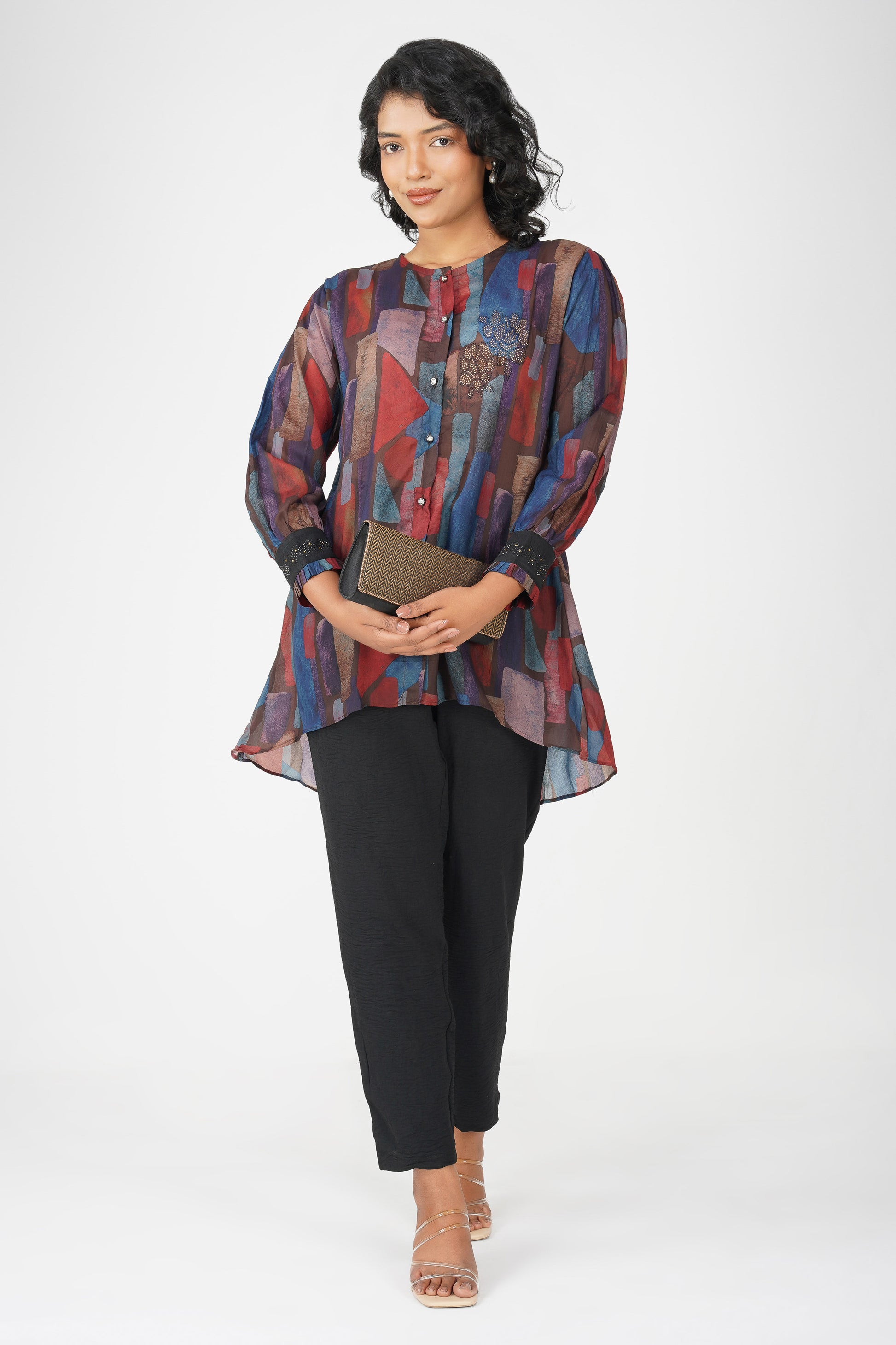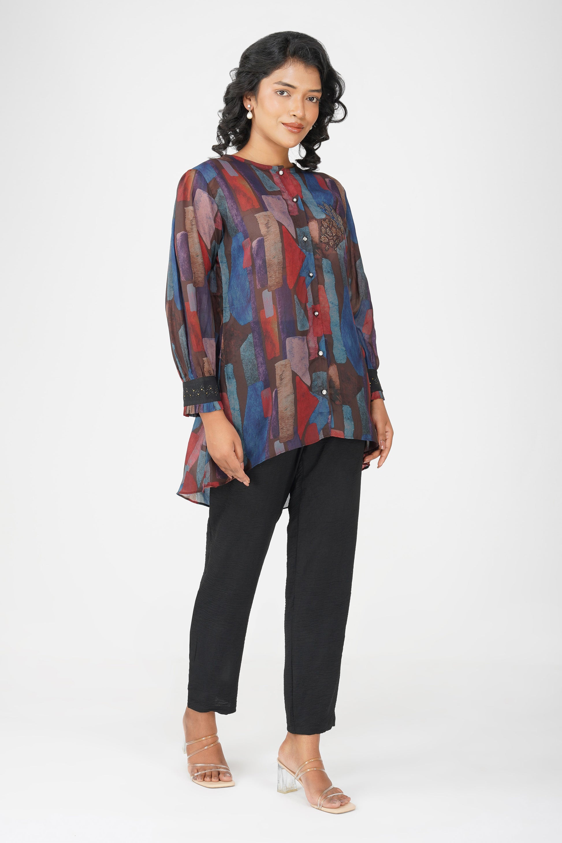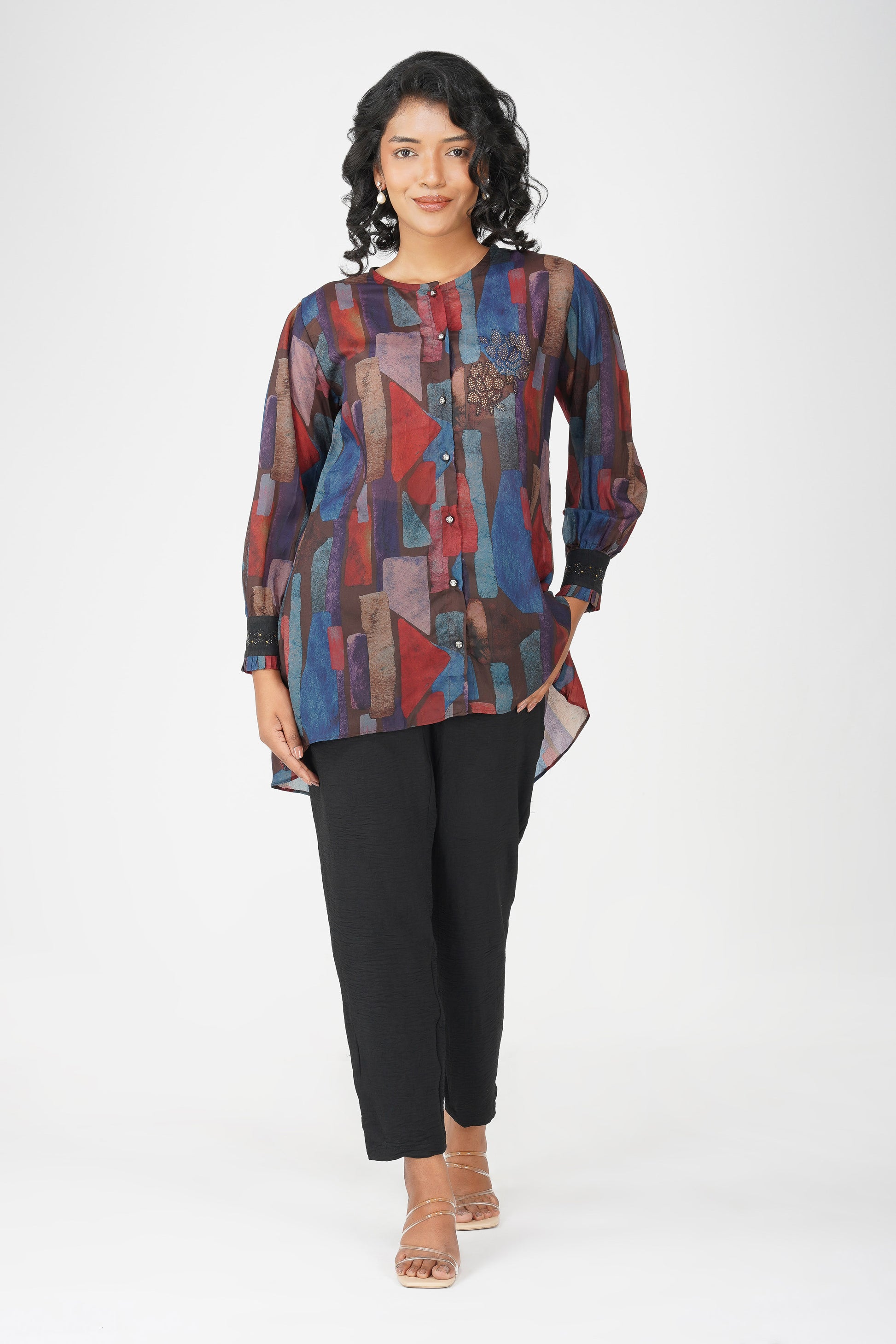 A soft sheer coffee multicolour tunic ๐ featuring rich prints and subtle Swarovski accents at the yoke and sleeves. Paired with solid black straight-fit bottoms and a dash of ruffle drama ๐โthis co-ord is a head-turner for effortless festive styling with a casual edge.
