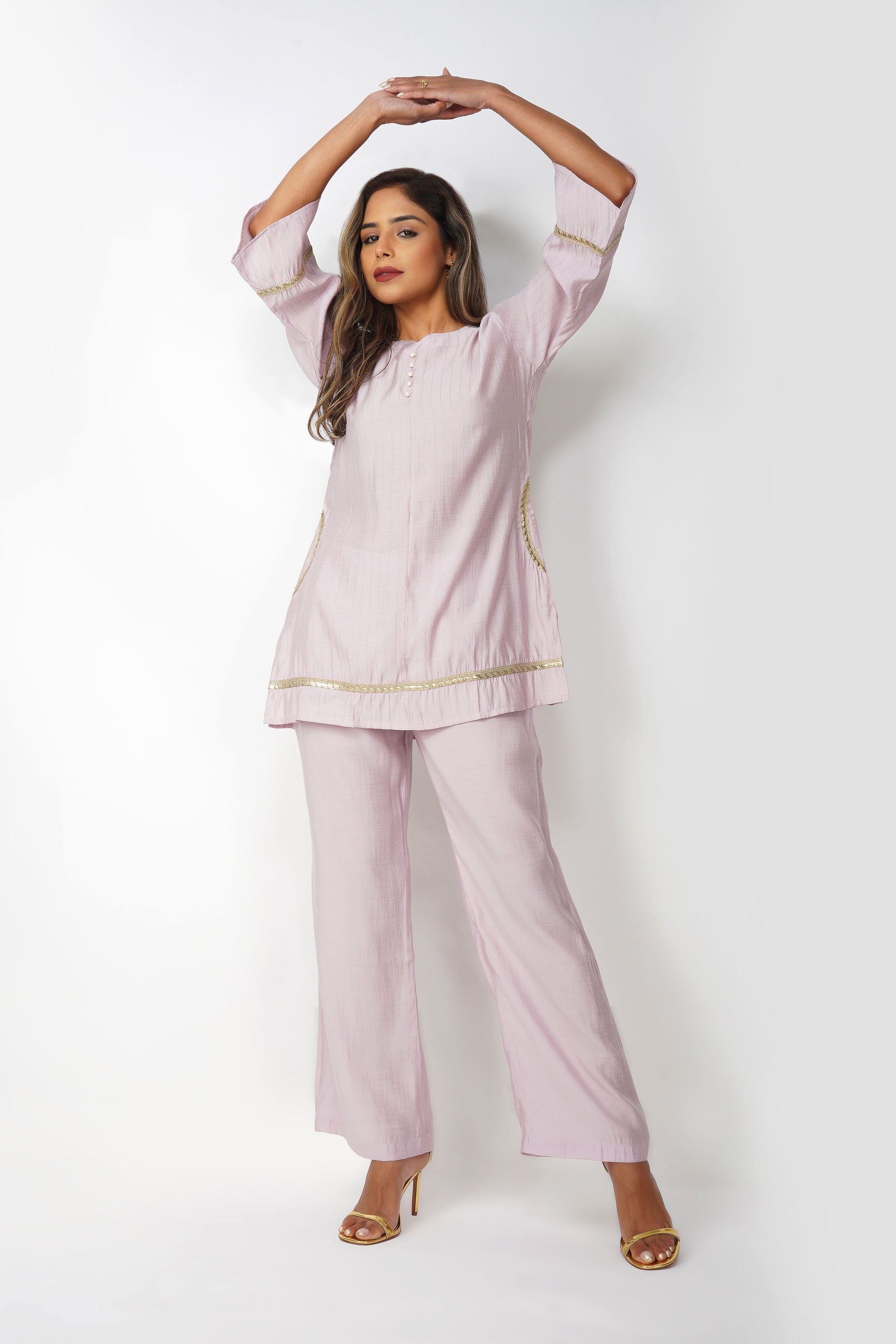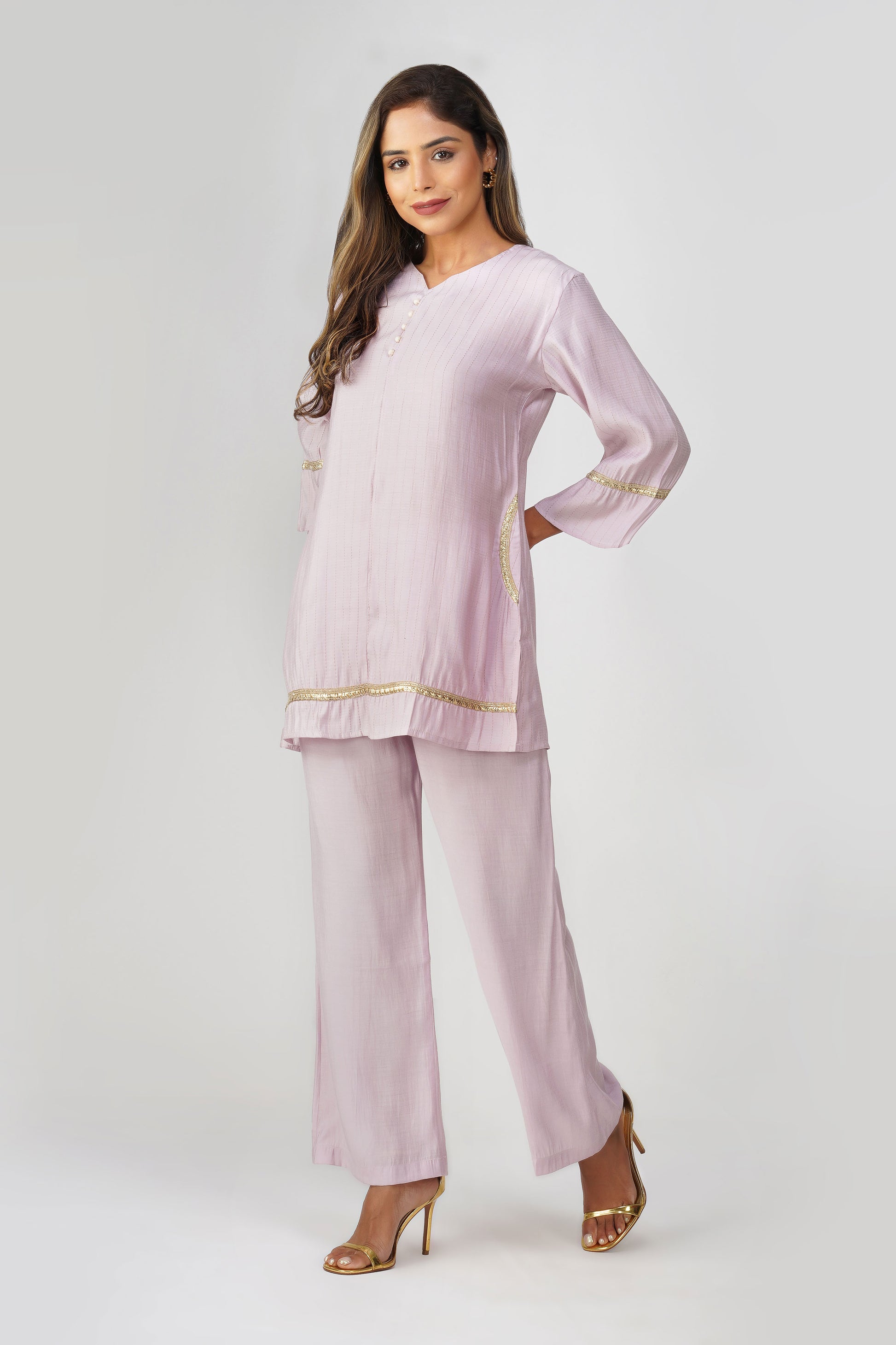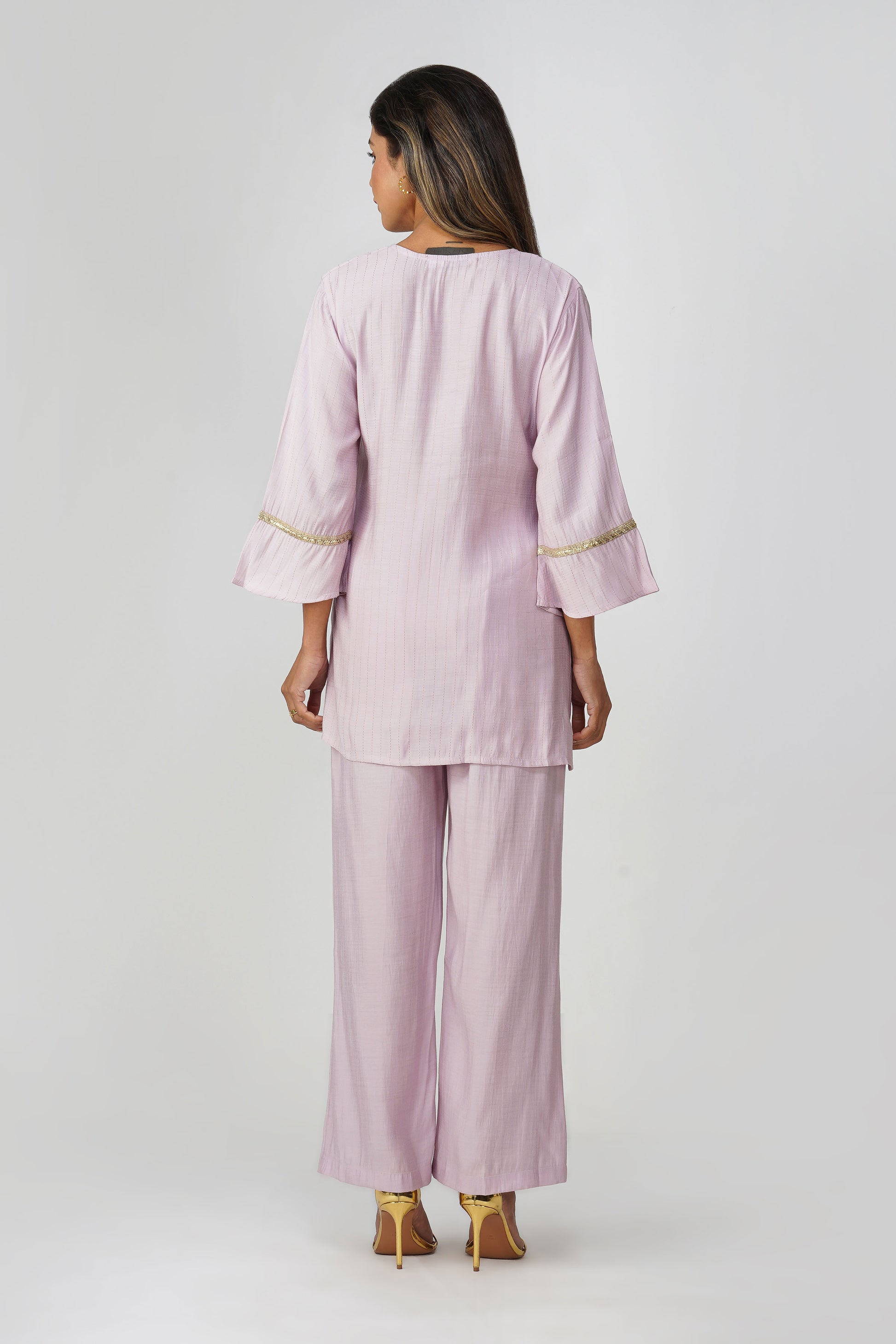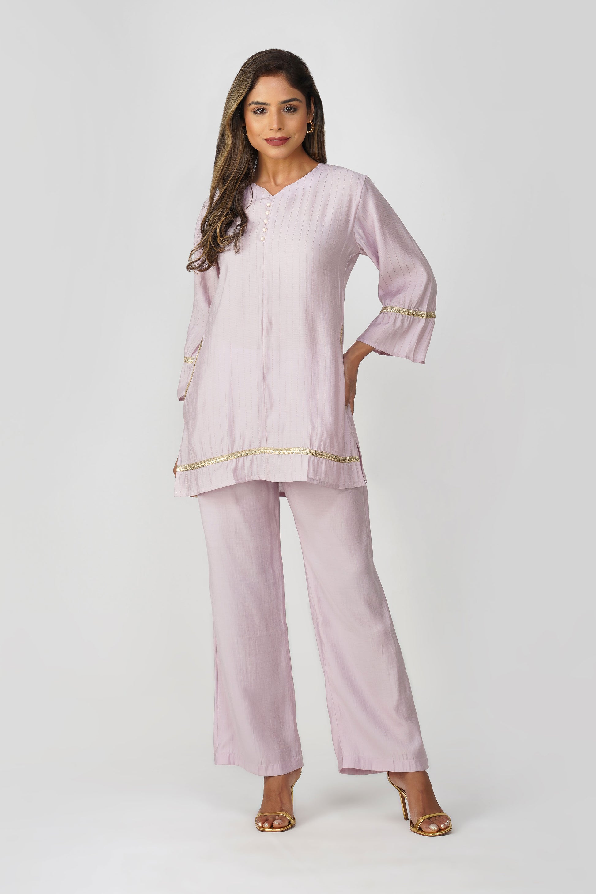 Graceful, soft, and dreamy β the Taara Coord in Lilac is a breath of fresh air βοΈπ Designed in a lightweight cotton-silk blend with tonal kantha-style vertical stripes, this minimal co-ord set plays with understated glam. The tunic features a soft V-neck with potli buttons, flared 3/4 sleeves, and golden sequin lace accents at the hem, faux pockets, and sleeves β just the right amount of shimmer for your day-to-evening transitions. Comes with breezy palazzos that have pockets too!