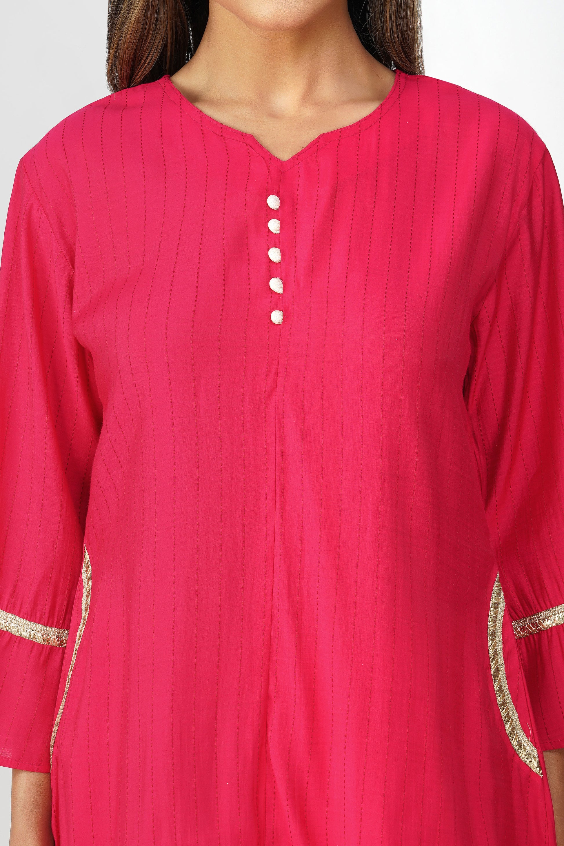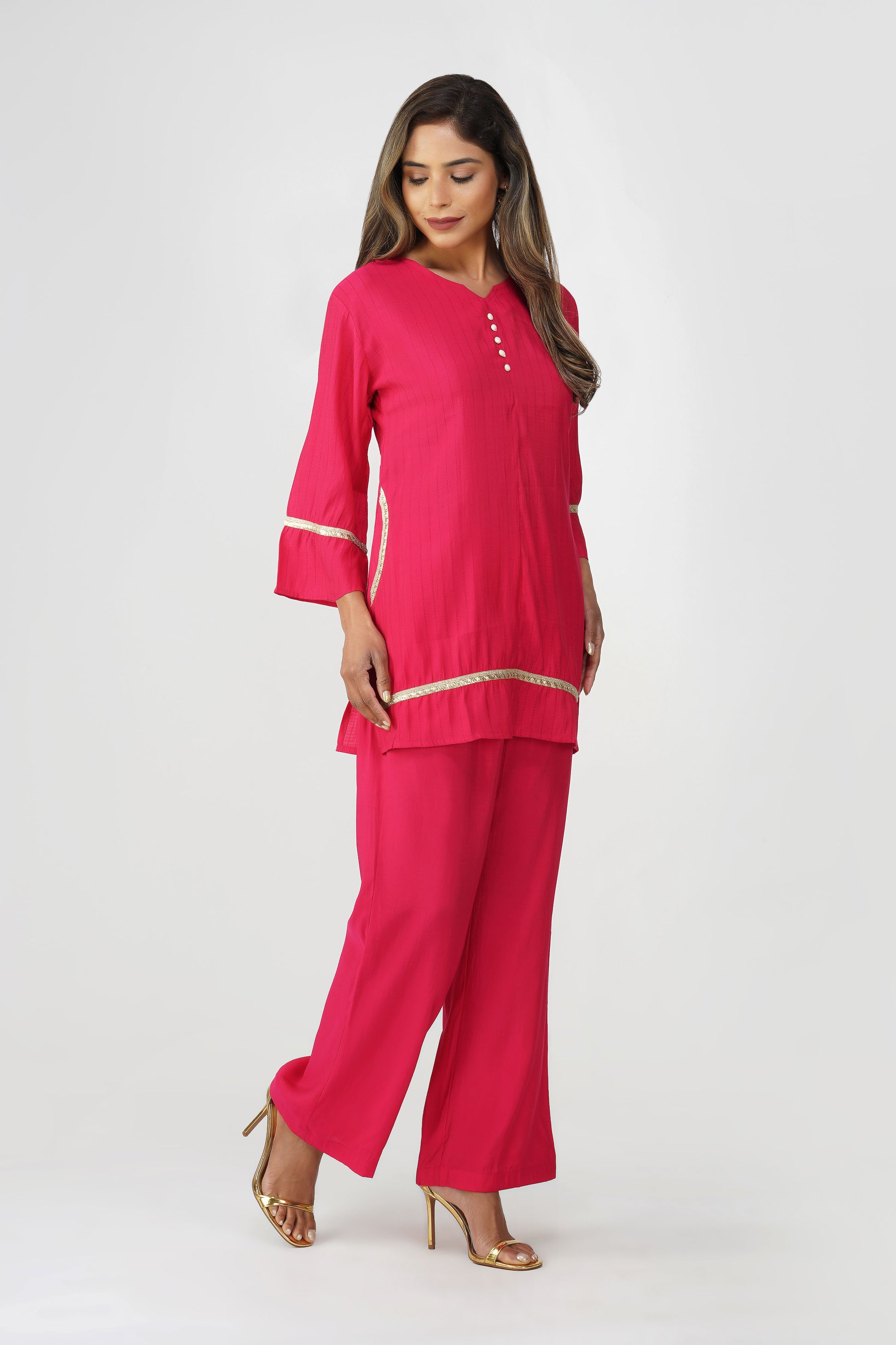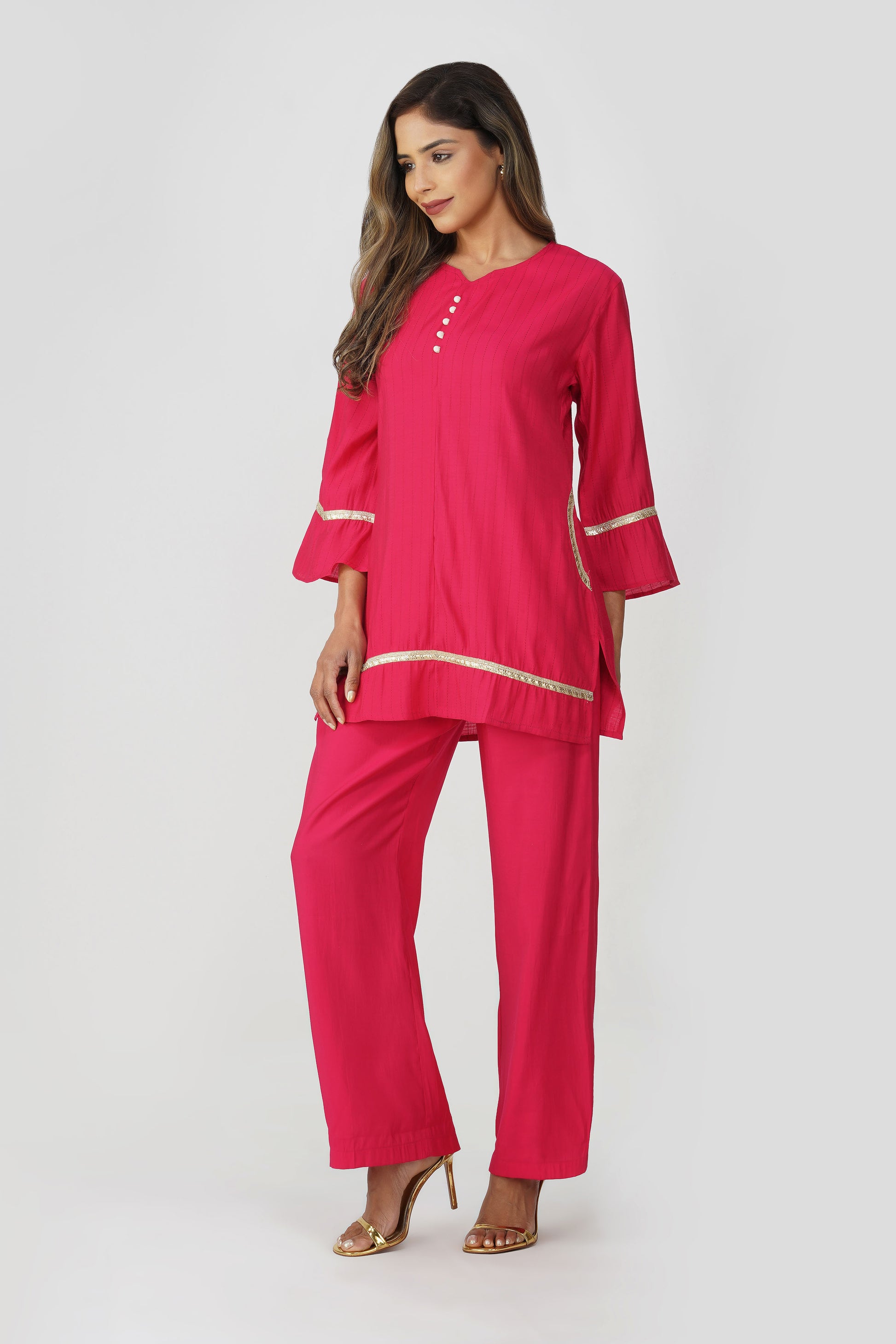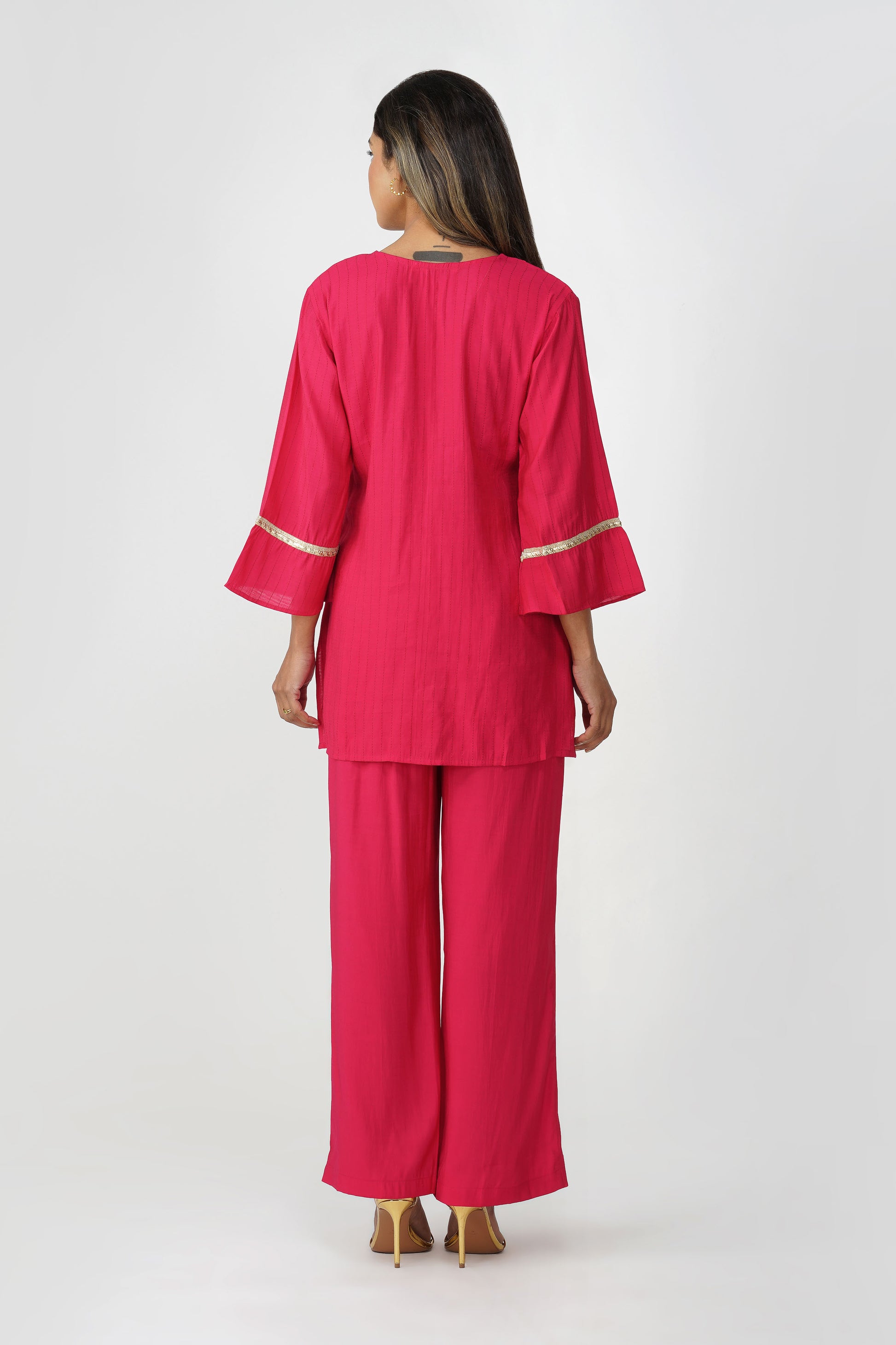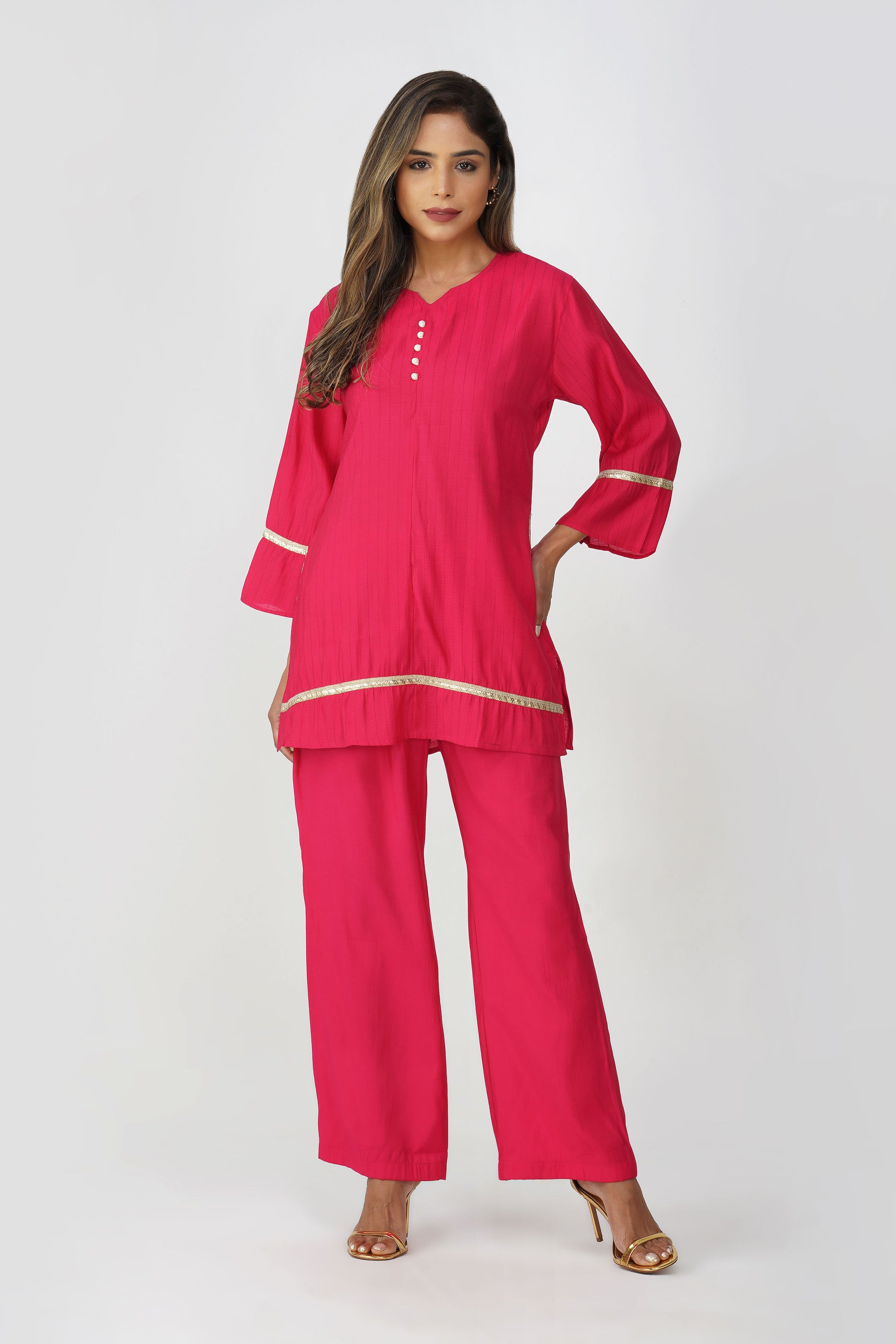 A burst of tradition and femininity, the Taara Coord Set in Rani Pink is the statement you didn’t know you needed 💕 With its soft cotton silk texture and minimal kantha-style vertical stripes, this set is equal parts delicate and festive. The kurta features a flattering V-neckline with potli buttons, subtle gold sequin lace on faux pockets, hem, and flared sleeves for an understated shimmer. Paired with wide-leg palazzos that come with pockets, it’s comfy, breezy, and ready for festive brunches, home functions, or a quick glam-up.